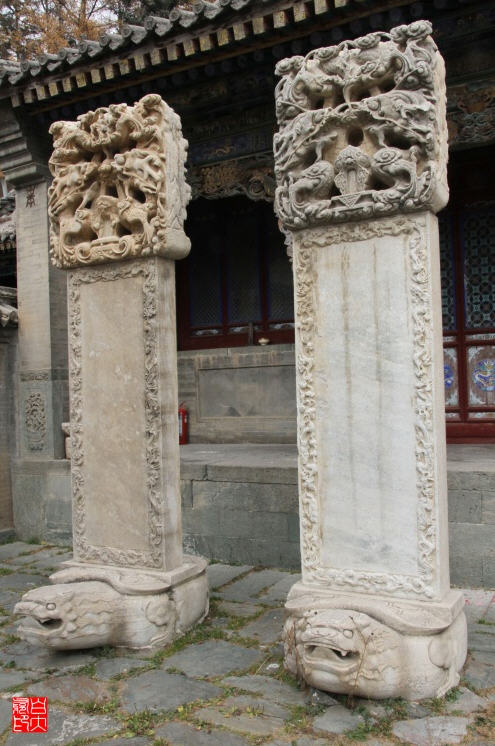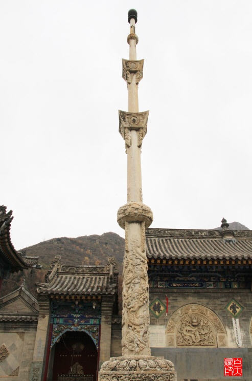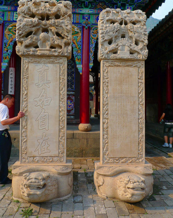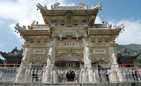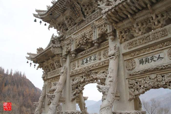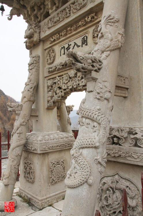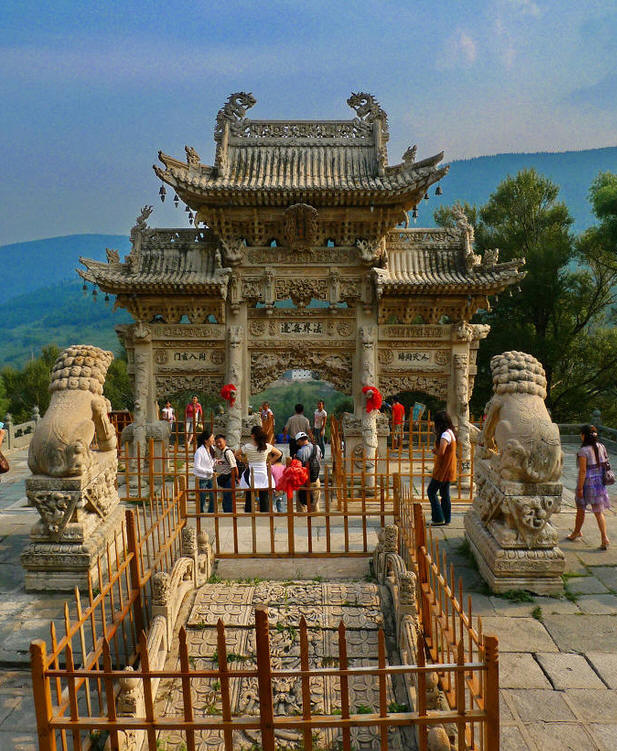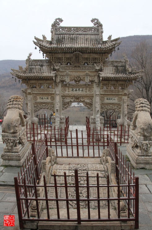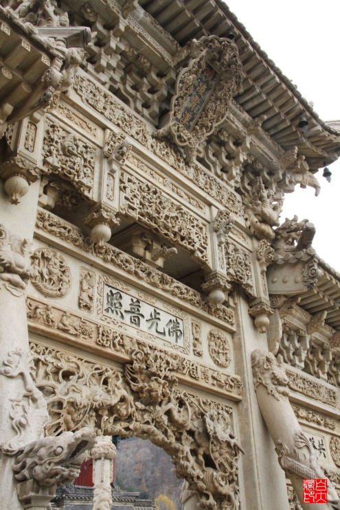 寺前,有108级石阶顺次层叠向北展开,最高的一层石阶上,有雕饰精致的汉白玉牌 坊。汉白玉牌坊建于1920—1924年,牌坊三门四柱,中高旁低,是一完整的整体建筑。据说,从1920年开始建造,历时5年才完成。在四根柱上,一直 到牌坊顶端都有装饰,很有气势。牌楼斗拱层叠,挑角飞出,上面刻有108条蛟龙,盘旋的姿态各异而又自如,雕刻得十分细腻。牌坊上的鸟、虫、兽类等图案, 玲珑剔透;人物、花卉更是生动逼真,是石雕艺术中的珍品。在五台山诸寺的石雕中,首屈一指。牌坊中央雕刻着“佛光普照”四个大字,意为佛的光芒普照人间。 左右耳门上雕刻“共登彼岸”、“赴会龙华”。竖匾上写着“峻凌霄汉”四个大字,意即屹立着的汉白玉牌坊高耸人云;背面写有“妙通玄机”四字。
