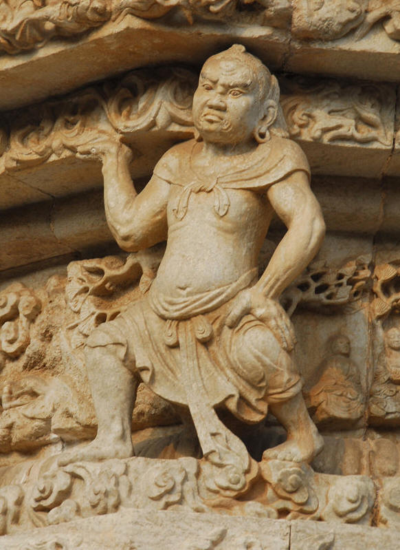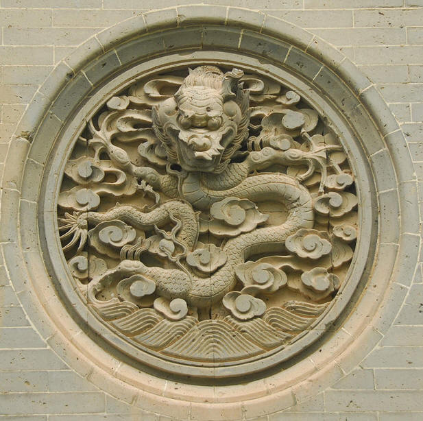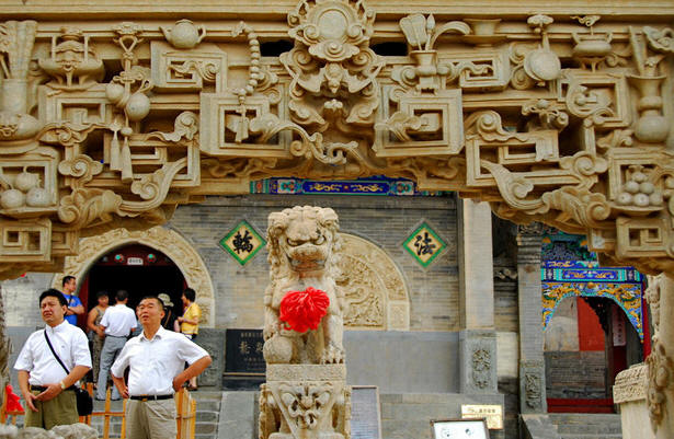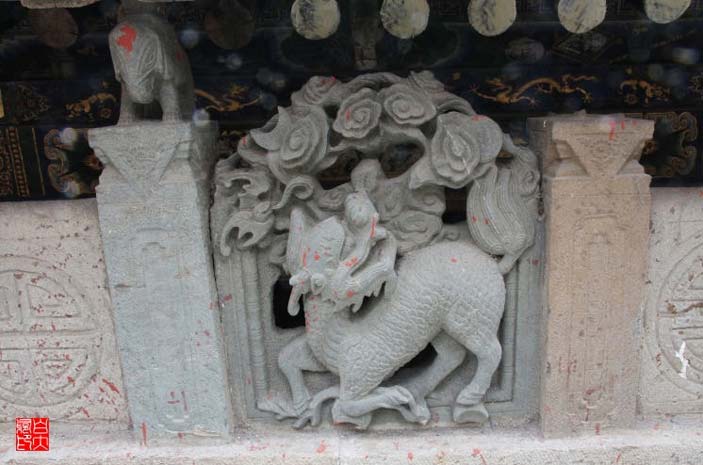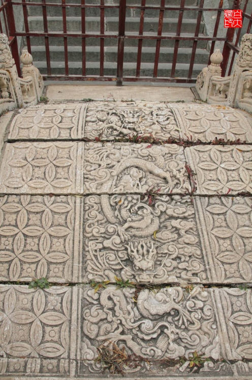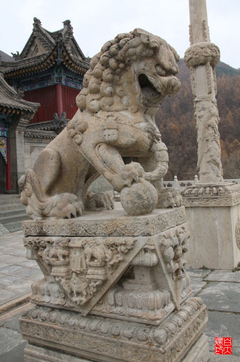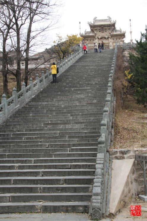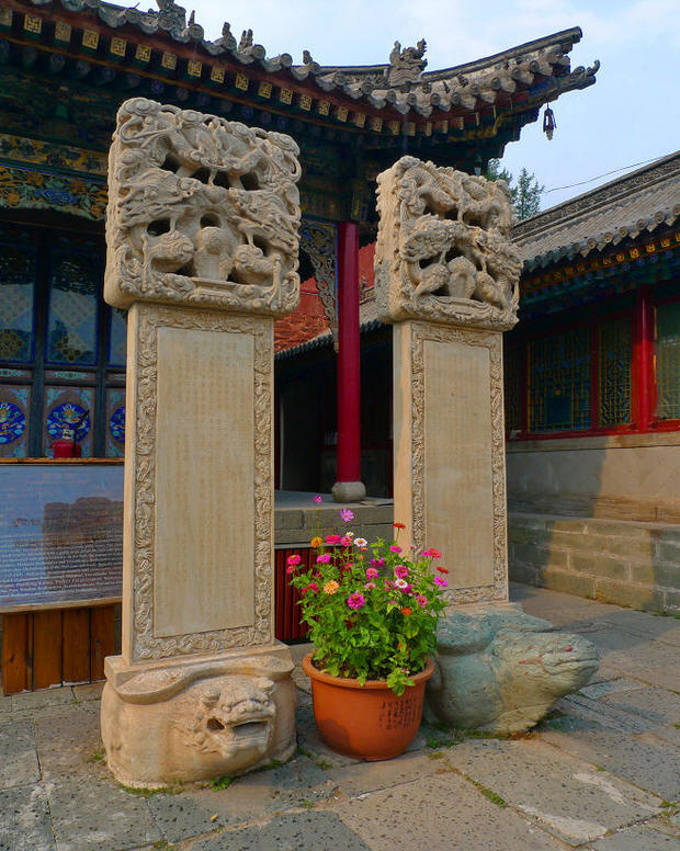 寺前,有108级石阶顺次层叠向北展开,最高的一层石阶上,有雕饰精致的汉白玉牌 坊。汉白玉牌坊建于1920—1924年,牌坊三门四柱,中高旁低,是一完整的整体建筑。据说,从1920年开始建造,历时5年才完成。在四根柱上,一直 到牌坊顶端都有装饰,很有气势。牌楼斗拱层叠,挑角飞出,上面刻有108条蛟龙,盘旋的姿态各异而又自如,雕刻得十分细腻。牌坊上的鸟、虫、兽类等图案, 玲珑剔透;人物、花卉更是生动逼真,是石雕艺术中的珍品。在五台山诸寺的石雕中,首屈一指。牌坊中央雕刻着“佛光普照”四个大字,意为佛的光芒普照人间。 左右耳门上雕刻“共登彼岸”、“赴会龙华”。竖匾上写着“峻凌霄汉”四个大字,意即屹立着的汉白玉牌坊高耸人云;背面写有“妙通玄机”四字。