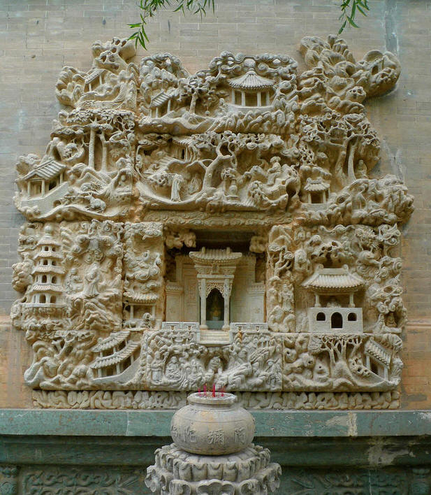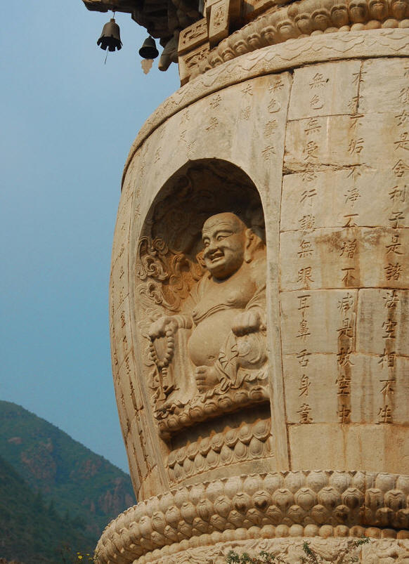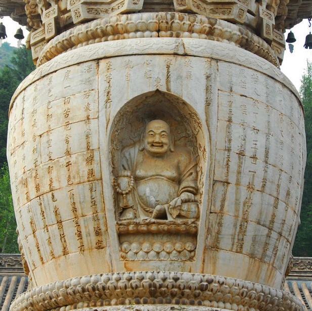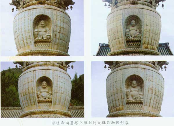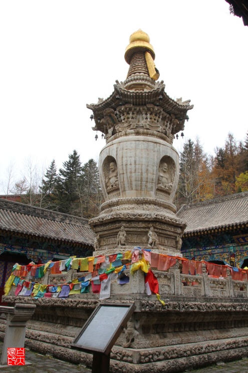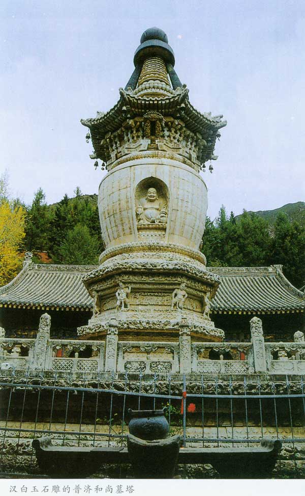 中院献殿和祖师殿之间,有一座工精料实、雕刻精致、装饰华丽、宏伟壮观的覆钵式的汉白玉墓塔。塔下方为汉白玉砌筑的四角束腰基台,台高1.5米,边长 6.7米。基台上下两层分别雕有仰覆莲办,束腰部分雕着慈眉善目的108尊坐佛。转角处的倚柱为刚劲有力的金刚力士,顶盔着甲,下肢微蹲,面目威武,神态 逼真,俗称“四大金刚顶宝塔”。基台上方,四边设有精雕细琢的栏杆、栏板,华丽美观,富丽堂皇。其上为汉白玉制的双层八角束腰须弥座,上、中、下三层雕有 各种花草鸟兽吉祥图案,束腰部分的壶门内有三教和民间宗教等历史人物故事图案,转角倚柱仍为虎背熊腰、肌肉暴突的金刚力士,支撑着塔身。其上还置一圆形圣 洁的蟠桃。这一莲座承托着覆钵式的汉白玉塔身,塔身四个正面均雕凿火焰形的佛龛,内各置结跏趺坐于束腰莲台上的大肚弥勒佛像。弥勒佛的大肚能容天下难容之 事,弥勒佛的大口常笑世间可笑之人。覆钵表面的其余部分,雕刻着《金刚般若波罗蜜多心经》,字体端庄,工整秀丽。塔身上又雕刻着一圈仰莲办,承托着普柏 枋、阑额、斗拱、椽、飞、沟滴等仿木构的八角塔檐,翼角翘起,脊端安有兽头,塔檐略呈弧形。塔檐正面还置有一块竖匾,上书“普济墓塔”。塔檐深远,棱角分 明,气魄宏伟,庄严肃穆,给人一种富丽堂皇、明朗开阔的感觉。塔檐之上为十三级相轮、华盖和金光闪闪的铜质宝珠。可惜,刹顶已坠,有待复原了。整个石塔造 型别致,布局严谨,气势雄伟,美观气魄,洁白肃穆,是一兼有中西文化特色的汉白玉石构建筑,是五台山石雕艺术宝库中的精品,也是山西塔文化中的一株艳丽奇 葩。