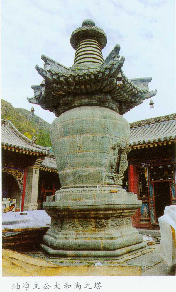 龙泉寺内还有一座岫净文公大和尚之塔,它和普济墓塔一样,都是石雕砌 塑的汉白玉墓塔。此塔基座为规整的六角束腰须弥座,上置两圈石雕仰覆莲办,承托着瓮形覆钵塔身。塔身正面置一石雕牌位,上刻“普济和尚徒弟庄严极乐堂上第 二代岫净文公大和尚之塔”。塔身上承托着仿木构的阑额、椽、沟滴、瓦垅、六角檐脊构成的塔檐。之上为七级相轮,饰有云纹的华盖和宝珠,是一座建于民国年间 的覆钵式墓塔。