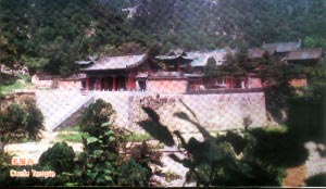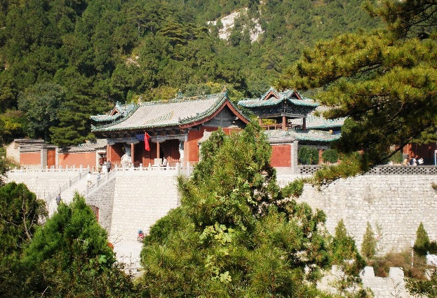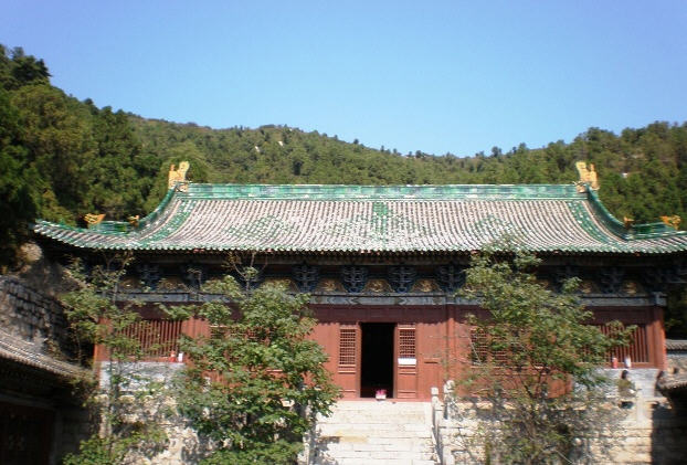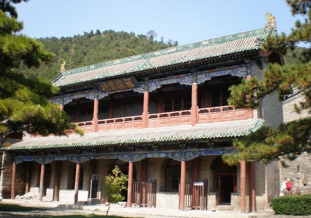 二进院正面为藏经楼,东侧是文殊阁,西侧是黑龙殿。藏经楼面宽5间,为下洞上阁式双层建筑,洞前6根 木柱矗立,形成抱厦,洞内青石砌成,为无梁结构,洞前两侧的明石柱上有傅山手迹。上阁藏经楼为重檐悬山顶。藏经楼东侧文殊阁面阔3间,阁内塑3尊高约5米 的佛像,造型精致逼真,为古代泥塑艺术之珍品,四周明代壁画保存尚好。阁下石砌窑洞为傅青主读书处,俗称红叶洞,洞前石壁上傅山的遗墨和清光绪年间 (1875年—1908年)镌刻的“傅青主读书处”石碑犹存。黑龙殿为面宽3间、进深1间的硬山式建筑,殿内神龛中塑有龙王1尊,左右各塑“风、雨、雷、 电”神兵4尊。门前有一石砌古井,井底石板刻有青龙一条,传为文殊菩萨显圣所留,号称龙池。