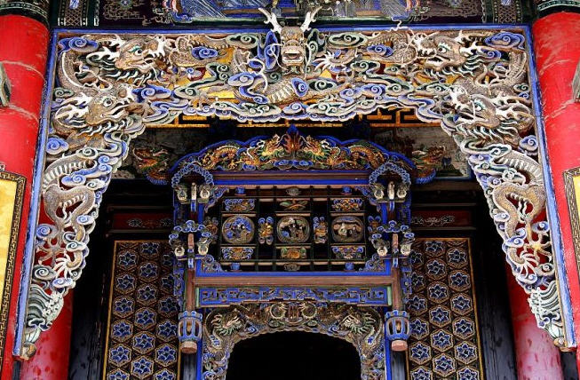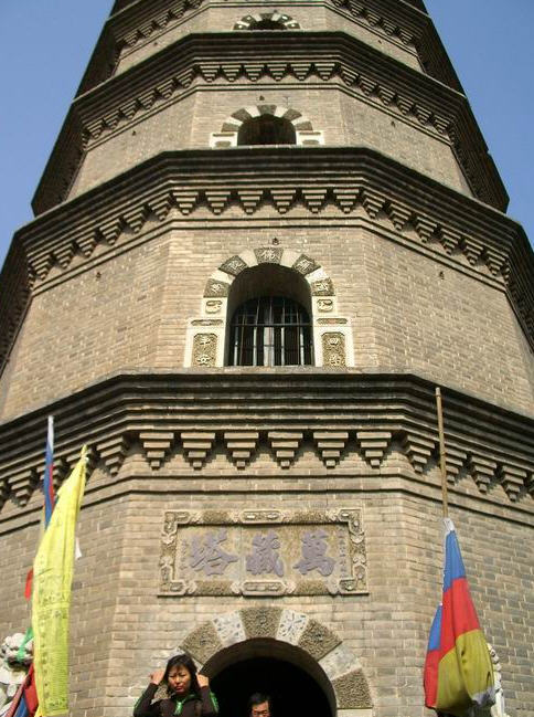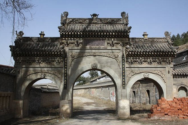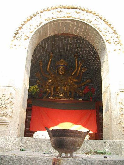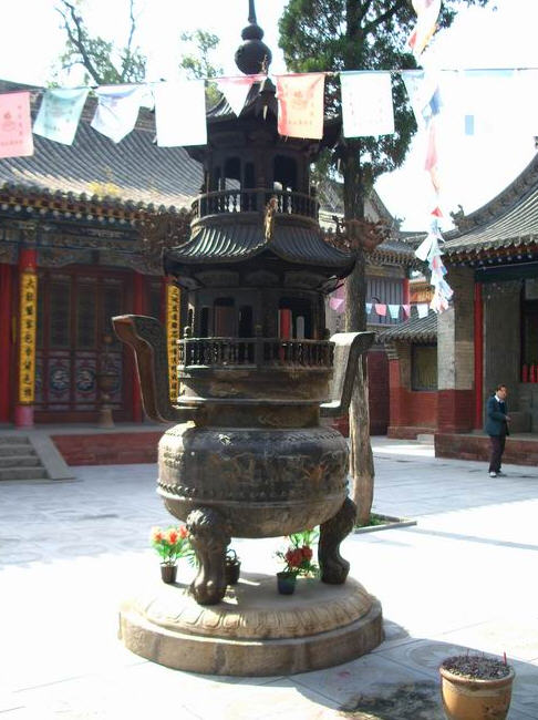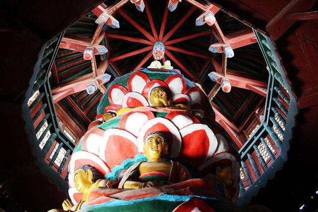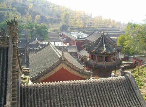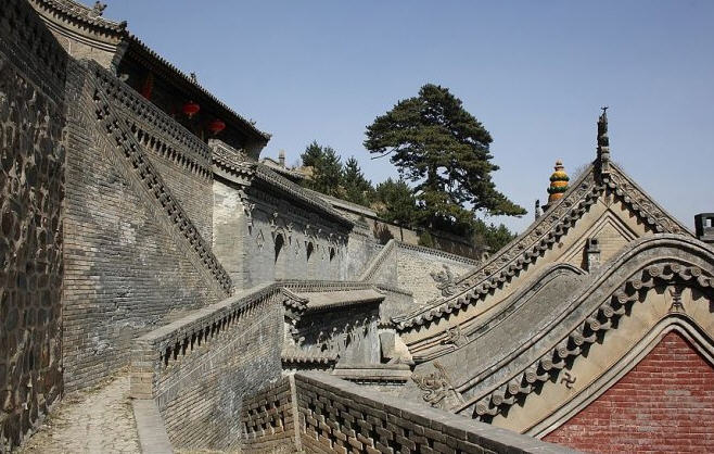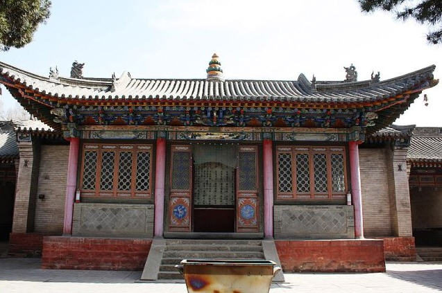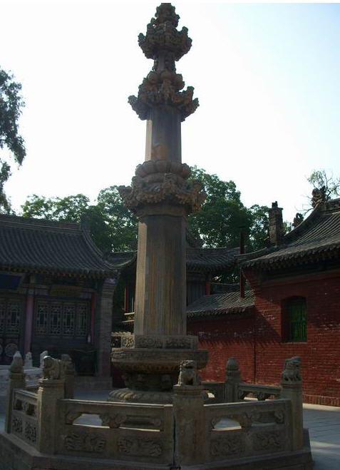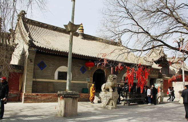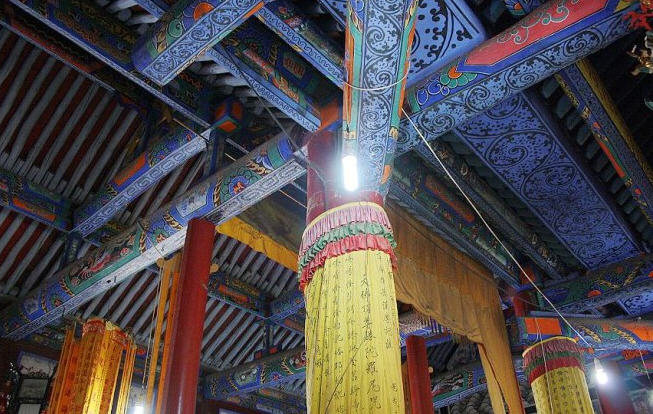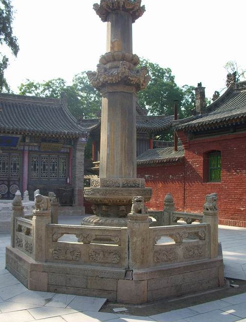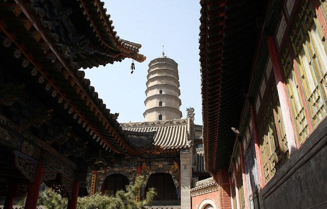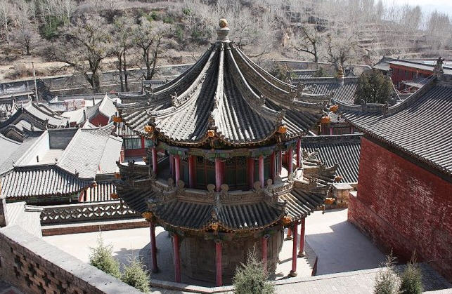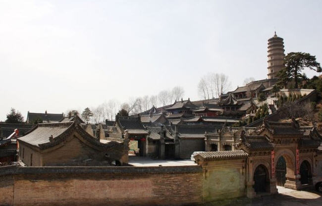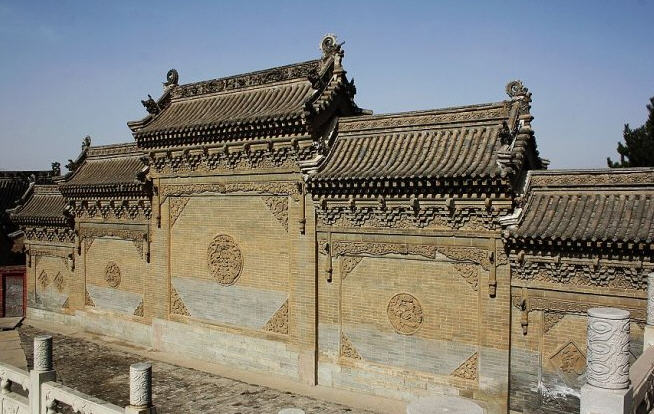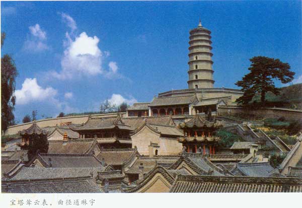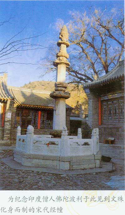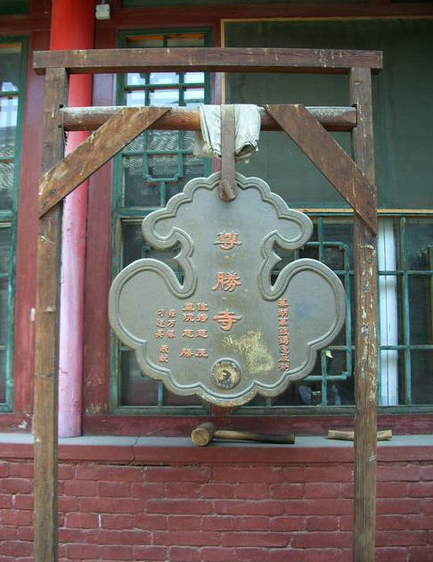 尊胜寺坐北面南,现有24个院落,350间房,从中轴线上看,自南而北有七进院落。第一进院是天王院。天王殿 前蹲着两个石狮,造型优美,雕刻精细。石狮两旁还矗立着两根石旗杆,青石质地,做工精细,是五台山众多寺庙中惟一遗存下来的文物古木匾一块,门两侧又嵌 “法轮常转”四个大字。殿内正面木龛内供着箕踞而坐的大肚弥勒佛,背后为木雕韦驮将军。殿两侧为持宝剑的南方增长天王,抱琵琶的东方持国天王,拿雨伞的北 方多闻天王和握紫金龙的西方广目天王。他们威镇四方,护持佛法,职顶为鲜见的十字歇山顶,内置钟鼓虎啸龙吟,镇守寺院。第二进院是大雄宝殿院,殿宽5间, 进深3间,单檐硬山顶。殿内正面供缅甸玉佛和迦叶、阿难、相貌庄严,雕刻精细为现代精品。东西山墙绘佛传达室60幅。画前为脱纱十八罗汉,形像优美,生动 传神。院内东西廊房是招待僧俗人等的客房。该院东面又有一院,院内有两尊《佛顶尊胜陀罗尼经》经幢。院内东为念佛堂,南为祖师堂,内供本寺历代祖师,供人 瞻仰。大雄宝殿西面也有一院,内建二层楼房,上为5间木构房屋,内供“西方三圣”。楼下为3间窑洞,称为地藏王殿。第三进院是三世佛殿院,正面是三世佛 殿,内供横三世佛,是樟木雕刻的佛像,面目慈祥,衣纹流畅。殿内两山墙为相好金妆的十二圆觉菩萨。该院的东西配房是客堂,两耳是二层楼房,东为方丈楼,西 为钱粮库。第四进院,是藏经楼院,南面为藏经楼,重檐歇山楼阁式,两层,16根明柱支撑,形成长方形的外走廊,上下对称。第五进院有三皇三圣洞,上下两 层,上层三洞,中供释迦牟尼,右供孔子,左供老子,谓三圣洞。下层三洞,中供天皇,右供人皇,左供地皇,这三皇三圣洞表明了三教合流的特点。第五进院内有 五文殊。最后一院建有万藏塔,故名塔院。塔系砖建,通高39米。该塔端庄厚重,宏伟高大,建于民国二十一年(1932),是五台山惟一的十二角九层密檐式 砖塔。它挺拔秀丽,高耸入云,置于该寺后高处,为尊胜寺的标志。