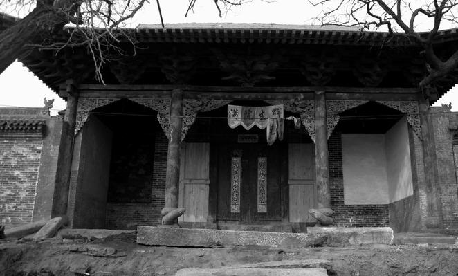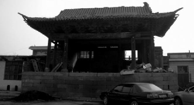山门前广场宽阔,每年农历陆月廿四酬神演戏之时亦作戏场 之用。最南端建有倒座戏台,条石构筑,高一人有余。梁架结构独具匠心,设计精巧,台口部分为歇山顶,其余部分为悬山顶,乃古代建筑之特例。戏台建筑整体造 型矫健雄伟。台口两侧筑有“一字形”砖雕影壁,雕饰内容丰富。壁心正中阳刻“奏假”二字,类似于今日之“此故事纯属虚构”之意。戏台内壁白墙上保存有清光 绪重建后至民国间历年庙会演出题字,记载演出时间、剧团、剧目名称,演出人员花名等信息,是研究晋剧及其它地方戏曲发展史的重要资料。