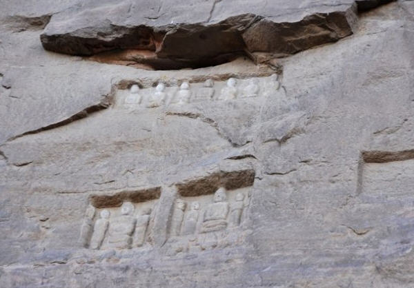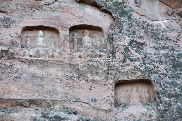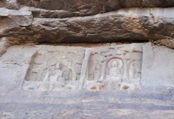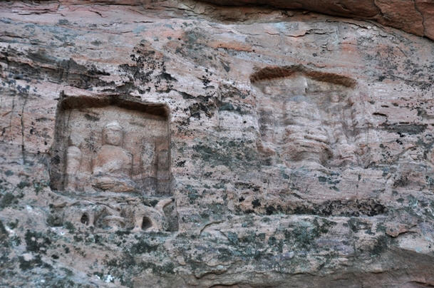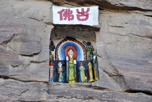 崖半有一右手掌印,据《郡国志》载:“北齐宣王遣人量之,长七尺。”五指分明,比例合度,指节、掌纹毕现。活像一只放大的右掌压泥印模。令人惊奇的是其 当初雕凿时的施工之奇,使人难以想象;危崖前倾,高数十米,在古代缺乏科学设备下,为此高空巨制,不能不为讶异叫绝。查之古籍,早在北魏《十六国春秋》 中,对它已有记述。则此一石刻工程最晚当在孝昌时代(525——527年)成书之前了。