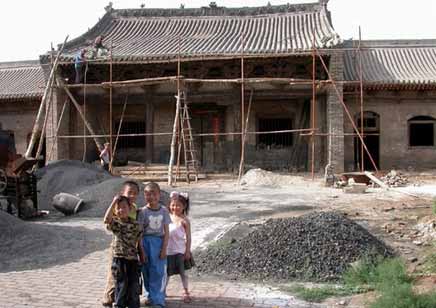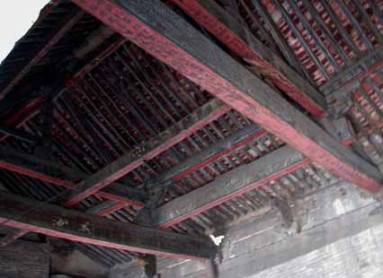 虞城村五岳庙:位于汾阳市东南的虞城村,距离普会村约半小时行程。此建筑现存戏台、正殿、耳殿和西配殿。正殿即五岳殿,面阔三间,进深呈前三椽 后两椽的不对称结构,硬山顶,前出廊,明间用板门,三门簪,次间为直棂窗。前檐柱头采用五铺作单抄单下昂双耍头斗拱,昂下出华头子,柱头斗拱后尾出一跳华 拱交于下劄牵并出翼形拱,下劄牵再隐刻华拱一跳承于里转令拱,下劄牵上又出半驼峰承上劄牵。补间铺作与柱头铺作一致,每间设一朵,后尾出华拱两跳及耍头, 昂尾挑于下平槫。殿内减柱造,梁栿制作规整,用四椽栿对前双劄牵,四椽栿南北两端与柱头栌斗和泥道拱相交,其上用驼峰和栌斗承平梁。平梁两端出襻间令拱, 上立蜀柱,用合(木沓)固定,柱头出丁华抹颏拱支撑叉手,再用栌斗和捧节令拱承托脊槫。根据专家分析该殿建于金泰和三年或更早,保留了宋代的诸多做法,清 康熙年间大修时改悬山顶为硬山顶,但梁架、斗拱保留原物。现为山西省重点文物保护单位。