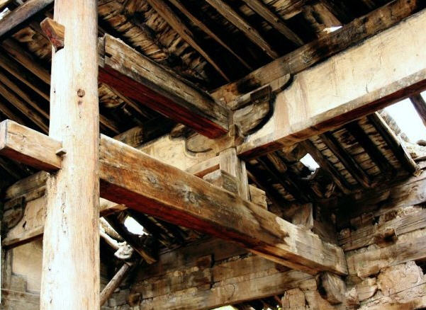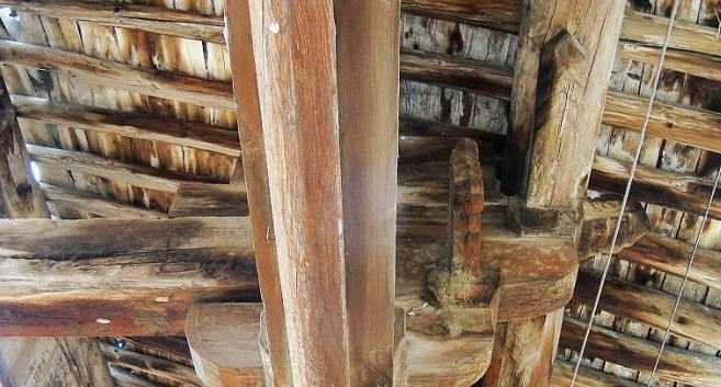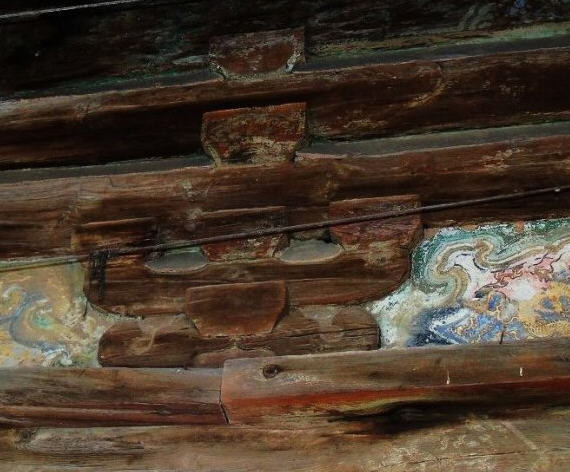 前后檐铺作基本相同,第一 跳头的交互枓内装翼型栱,第二跳头以散斗加蝉肚纹替木托橑檐槫;铺作中只有耍头不同:前檐为卷云状,后檐为蚂蚱型。铺作第一跳并非骑槽檐栱,而是“骑槽 状”压跳--- 压跳后尾卷杀成栱臂;第二跳是殿内乳栿出跳,这种形制有人认为是中唐之前的构造特征;耍头和衬方头都是另设,其后尾并不加工,原状安装,这种形制为晋中一 带金、元时期较为典型的做法;衬方头不出头。还有一个小动作值得一提:素枋在屋废下的出头被砍成批竹形。