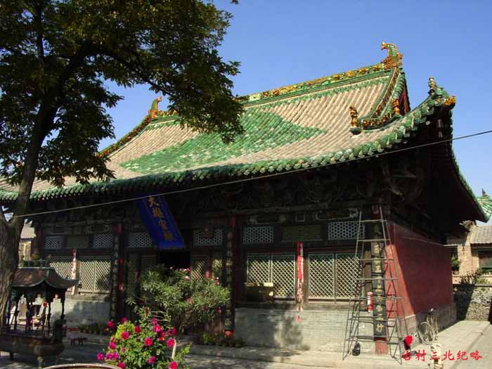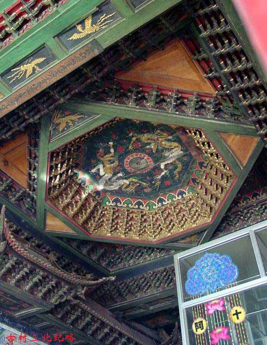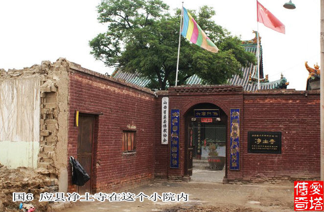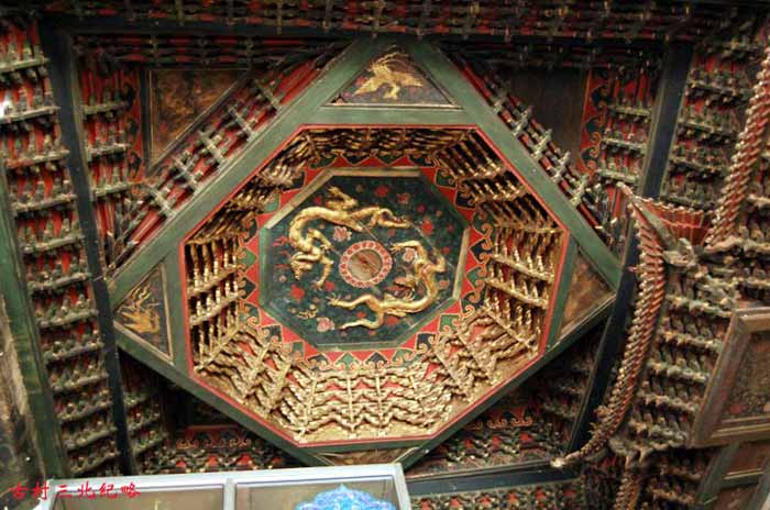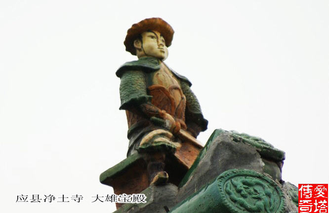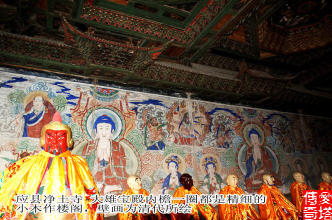 应县城东北隅,有一座净土寺。寺建于金代,建筑多已破损,但大雄宝殿尚存。大殿建于金大定二十四年(一一八四年),殿平面近方形,深广各三间, 单檐歇山顶,琉璃瓦屋面。殿内的壁画为清代绘制,构图和技法均保留了民间画风。 大殿内的金代藻井极为珍贵。藻井是中国古代建筑中室内天花的一种装饰性处理,多做成方形、多边形或圆形。宫殿或寺庙殿宇中多做成斗八藻井,藻井上装饰 各种花纹、雕刻或彩画。无论面阔三间或五间的建筑,大多只在明间正中施用一个藻井。净土寺大殿的藻井却布满三间殿宇的全部天花。明间为斗八藻井,正中金龙 盘线,气势磅礴。两次间配菱形和斗四藻井。殿内三周和藻井平齐的墙头,都装有天宫楼阁。这些楼阁与藻井相呼应。当人仰观殿宇的顶部时,感到亭台有序,楼阁 重重,金碧辉煌,如入仙境。其建筑模型比例适当,结构紧凑,无疑是金代建筑实物的缩影。这种形制规模、制作精致的金代藻井是迄今所发现的孤例。