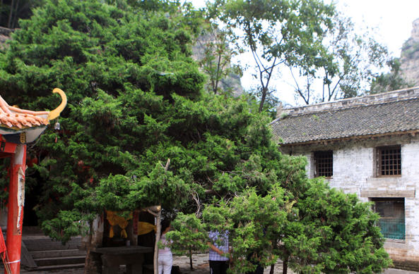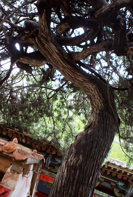 院里有一些石碑,唐宋元明清各朝均有。还有一棵百多年的龙凤松柏树,可谓镇寺之宝。树身如苍龙盘曲,尖顶直刺入蔚蓝的晴空,谁看了都会精神为之 一震。树冠如一凤凰矗立,安静祥和。奇怪的是它一半长柏枝,一半却生出松针,没有嫁接也没有旁逸斜出的理由却单单生出两种结果来。