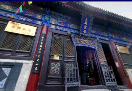 从大钟楼左侧穿过一座小院便进入大雄宝殿所在四合大院,这里是南山寺主院,坐北朝南彩绘一新的 大雄宝殿内有精美塑像和雕像。大殿主供释迦牟尼佛,两旁站立者为阿南和迦叶两大弟子。佛坛前正中是文殊骑狮石像,右侧为木雕普贤菩萨,左边为石雕送子观 音,殿两壁是十八罗汉。该殿的造像之精,在五台山寺庙中颇有名气。特别是送子观音,一个白胖胖的小孩,天真无邪,活泼可爱,慈爱的观音左手抱护小孩,右手 抚摸孩子的小手,使人倍感亲切。另外,脚踏莲花,臂有十八,身后跟着两头活蹦乱跳的小象的普贤造像亦相当精美。而十八罗汉表情造型各不相同,给人印象同样 很深。出大雄殿,从左侧拾阶而上,穿过善德堂,便来到最上三层的佑国寺。这里可说是石雕的海洋,几乎是无石不雕。一进院共有石刻图案316幅,以“穆桂英 挂帅”、“天女散花”、“苏武牧羊”等最为人们熟悉;二进院共有360幅,有“孟母择邻”、“太公钓鱼”的故事等;三进院共294幅,有“三顾茅庐”、 “孙悟空、猪八戒登仙山”等情景。整个佑国寺石刻图案近千幅,内容之丰,数量之多,刻工之精,堪称全山一绝。