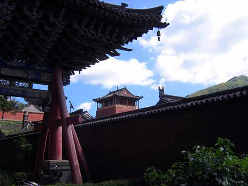 南山寺引人入胜之处是它的气魄、石雕和泥塑。我们沿登山古道盘桓而上,未入山门已被古刹的气势所折服。五台山寺院多有影壁,而南山寺最下面 这一影壁是最大的,宽17.3米,高约8米,石砌底座,细磨青砖筑壁身,中嵌汉白玉石雕,多有题词和对联,顶部壁檐有砖雕。转过影壁便是气魄雄伟的108 级石阶和白牌楼。108级台阶在五台山不只一处,但比较而言,菩萨顶的台阶是以陡峭著称,而南山寺的台阶则以宏伟宽大闻名。台阶分三段,每段36级,直抵 尽头的牌楼。南山寺的这座牌楼同样以气势取胜。这座牌楼宽达12.8米,厚1.6米,高9米,四方石柱中券三眼拱洞,上覆三面楼头,中间大而高,两旁稍低 矮,比例匀称,主次分明,清一色的白石雕构更使牌楼气度不凡。中券洞上方的“信天由命”石刻匾额更令人玩味。牌楼之后的大钟楼兼作山门,下面是方台石券门 洞,上面是两层木楼,高大而稳健,我们可以顺门洞两侧小洞的28级台阶登上木楼,楼上四周围以石栏,围栏上刻各种花草树木,雕工纯熟。凭栏远望,清水河谷 的风光,中台、北台、南台的雄姿可尽收眼底。