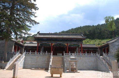圣母殿为寺内主体建筑,面宽、进深各三间,平面方形,单檐歇山顶。斗栱为四铺作计心造,单抄单下昂。梁架结构为六椽栿对后乳栿用三柱。