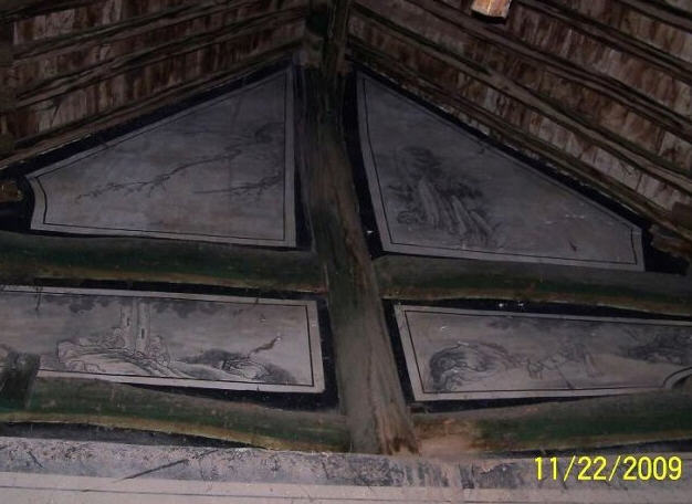 正殿内的梁架普通无异,但是梁架及殿壁三面满布彩绘及壁画,而且保存的非常完好,几乎没有风化或人为破坏,只有前廊下左右两侧的壁画,大约因为某种原因,用白灰和泥进行过涂抹。