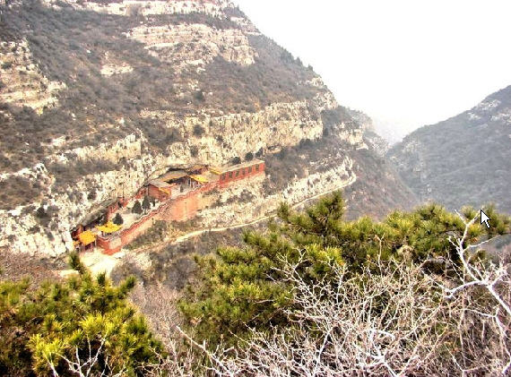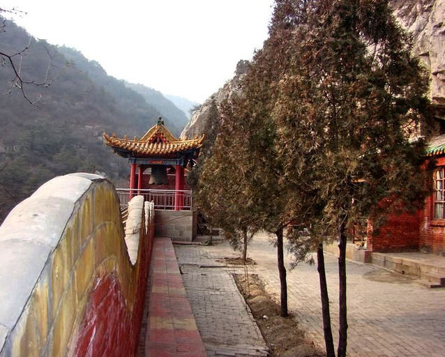 抬头仰望,右前上方山腰上绿树枝头掩映着一堵红墙,石窑寺到了。