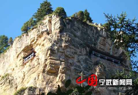 右面住房的石壁上也有一个黑洞,高约一米。由此可通往寺东绝壁上的另一座小庙,再直达古代的金安寺。该寺外加悬空栈道以及悬崖石壁道,总长42华里,是连通古代普应寺、金安寺、北天寺、朝阳洞等悬空寺庙的空中道路。