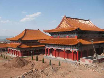 山门,又称三门,为重檐歇山式屋脊,琉璃瓦顶,彩耀眼。山门内泥塑哼、哈二将。进山门即一进院。左右便是相隔东西的钟楼和鼓楼,内有大钟和大鼓。钟鼓楼为双层梁飞檐式,顶部四边翘起。