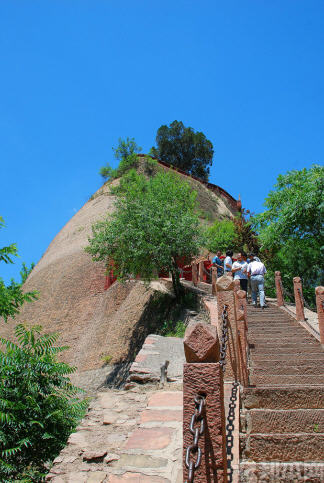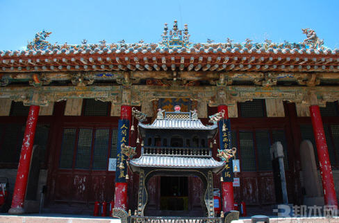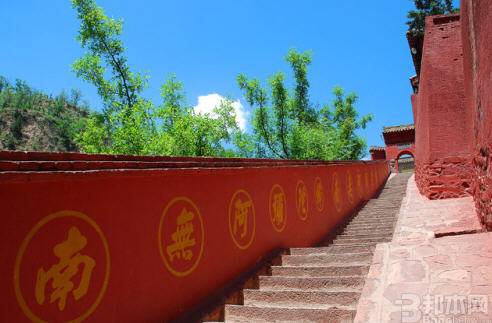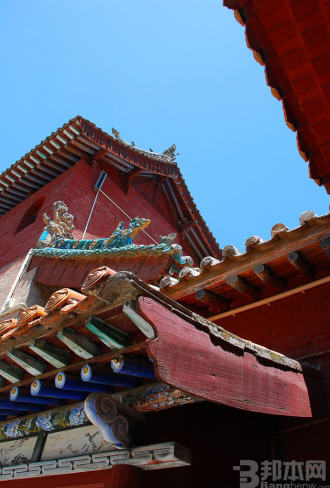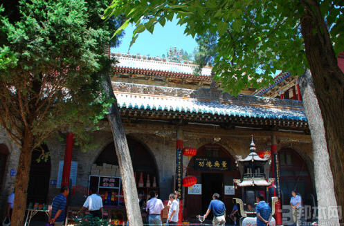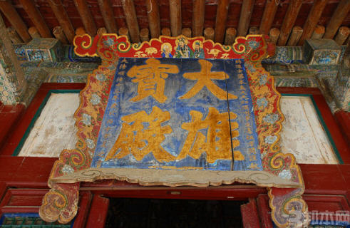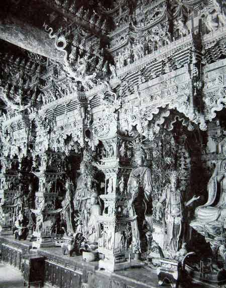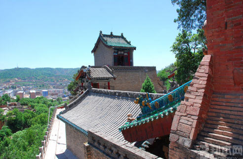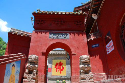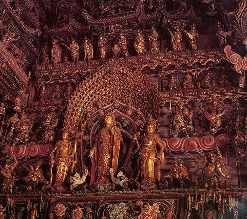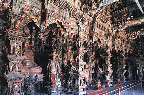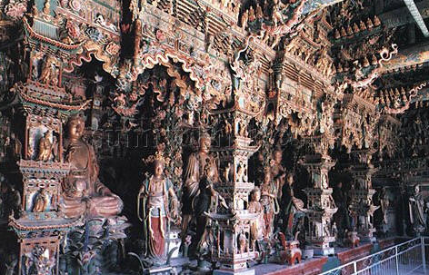 风光。后院是无量殿、韦驮殿、左右厢房和前向掖门等建筑。无量殿坐西向东,内有数十尊铜佛像和木雕天宫楼阁。前院左右为文殊、普贤殿,正中为大雄宝殿。 大殿内满布大型彩绘悬塑,正面横排着5个互通的佛龛,5尊主佛端坐其中,左右两侧是10尊弟子站像。33层的天宫楼阁,雕梁画柱,曲折回环。殿内布置严 谨,多而不乱,是我国明末彩塑中罕见的珍品。