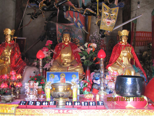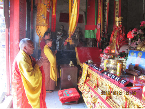 厌恶了寺庙群的纷乱嘈杂,便趁暮色访幽。出镇中心七八公里,见青山翠谷间有登山石径,攀登半小时有一座庙宇立于山腰。庙宇围墙涂有朱红色,围墙的墙皮脱 落了很多,块块形状各异的土色掺杂在红墙上,刻画着岁月的沧桑与久远。不大的庙宇建在山峰的东南侧,寺庙房檐下牌匾上写着“明月寺”。那早已脱漆的大门吊 着锁,庙前矗立着高大的石牌坊,石牌坊脚下青石板间那丛生杂草,在渐落的夜幕下,使寺庙显得尤为凄清。交谈和脚步声惊动了主人,侧门洞开,步出一位残腿僧 人稽首问道:“施主有事?”我们答道:“打搅师傅了,路过宝刹参观一下。”僧人说道:“来此就是缘分”,说完便主动为我们做起导游来。