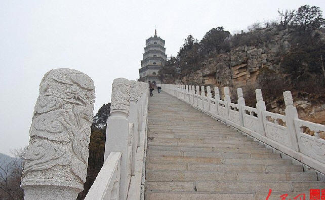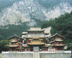 寺西北里许山崖如削,半崖建娲皇阁一座,宽五间,高三层,构造奇巧。阁西侧不远处,依崖刻凿有法显和尚全身巨型浮雕像,高达十几米。法显右手抱经卷,左 手持念珠,布衣僧履,衣带飘飘,风尘仆仆,栩栩如生。巨像右边磨崖石刻上镌有赵朴初的题字 “ 东晋高僧法显法师 ”,左边石壁上刻有法显生平。