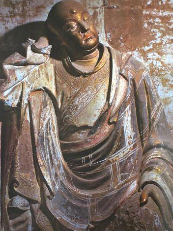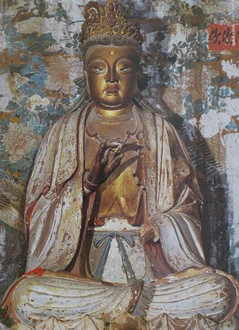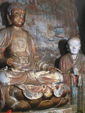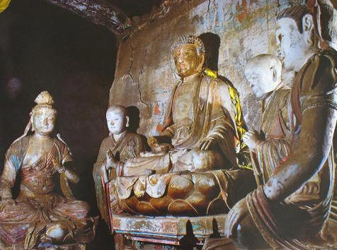 弥勒佛两侧,塑着站立的阿南、迦叶二弟子,迦叶居左,阿南在右。佛坛前部左右两端设置两个须弥座莲台,左边台上坐普贤菩萨,一腿盘曲,一腿下垂,这种优 美的坐姿称为“游戏坐”,莲台的束腰部分则雕刻着他的坐骑——白象;右边台上坐文殊菩萨,也是“游戏坐”姿势,莲台束腰部分雕刻的是狮子。佛坛中部本来有 两尊对称的供养菩萨,现存的只有右面的一尊。供养菩萨形体较小,单膝跪地,雕塑的手法侧重在表现他虔诚供养的神情。