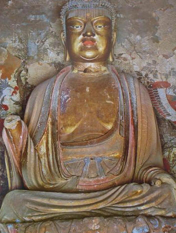 主像弥勒佛,面相丰腴,蛾眉、细眼、高鼻、小嘴,具有典型的唐塑“丰肌秀骨”的风格。弥勒佛肩披大巾,腰围羊肠大裙,双腿自然下垂,坐在须弥座上,左手置于膝上,右手作说法印,故称为“垂腿弥勒佛”。