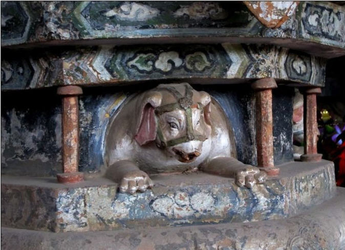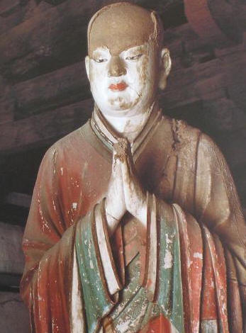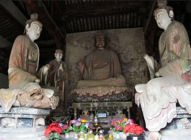 南殿现存彩塑12尊,佛坛上正面的5尊塑像是宋代作品。当中为释迦佛,结跏趺坐(盘腿打坐)于莲台上,两侧为文殊、普贤二菩萨和阿南、迦叶二弟子。雕塑注重写实,生动传神。