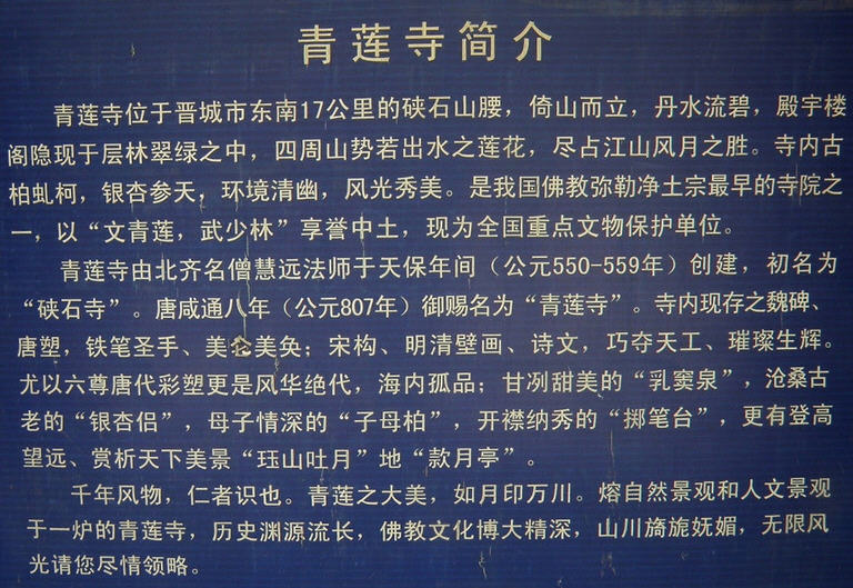 青莲寺位于晋城市东南约17公里的硖石山中,人称“晋魏河山第一寺”。青莲寺有上下两所,下边的一所创建在前,称古青莲寺;上面的一所年代稍 晚,俗称新青莲寺。寺院三面屏山,一面下临丹河,景色秀丽,幽深古雅,集自然景观与人文景观于一身,现为全国重点文物保护单位。