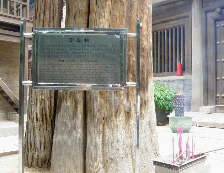 青莲寺后院,生长着珍奇的“子抱母”古柏。母柏早已干枯,子柏紧紧缠 绕母柏,生机勃勃,枝叶繁茂。相传在百年以前,母柏枯死时,寺僧准备第二天把它砍掉,谁知一夜之间,一株幼柏攀着母柏的树干缠绕而上,紧紧地把母柏抱住, 寺僧不忍心砍伐,留下了寺院中的这一奇景。“子抱母”古柏附近,有两株银杏树,躯干粗壮,高大劲挺,荫天蔽日,是寺院中的又一景观。这种树非常罕见,成活 率极低,果实还是珍贵药材。这两株银杏树有一株是雌树,每年能收获果实百余斤。