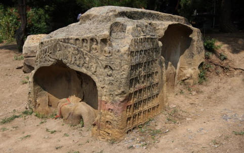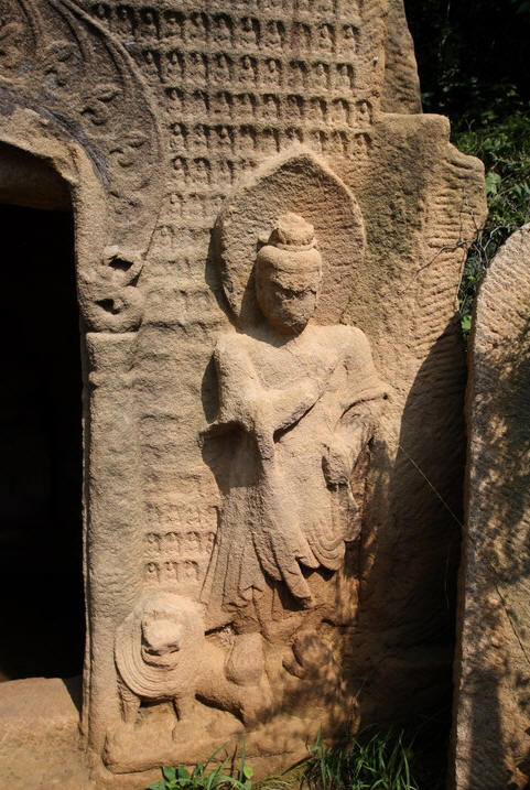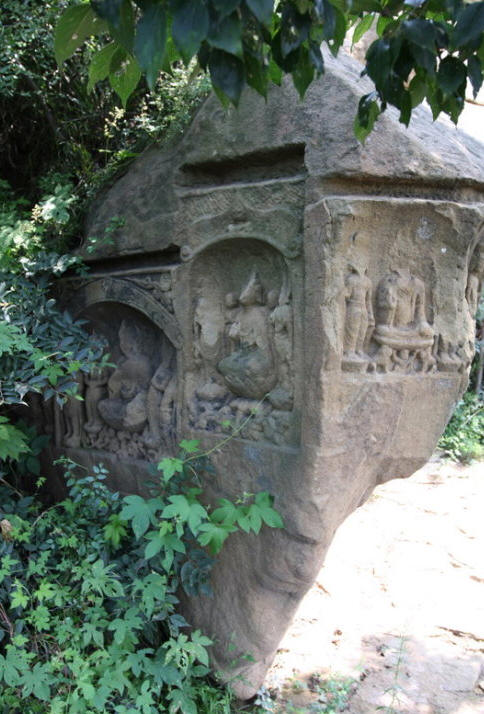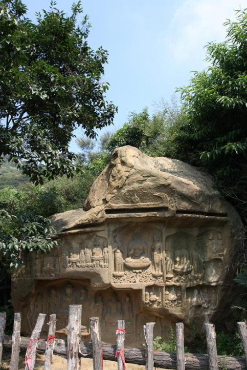 七号窟也叫千佛洞。洞内没有主尊佛,遍雕小佛有1680尊,因而得名千佛洞。窟门外两侧是高浮雕力士像,各脚踏卧师,造型潇洒,栩栩如生。洞内四壁遍布小佛像共约1680余个。千佛洞是由两块巨石并在一起组成的,我们不得不惊叹古人的智慧和精湛的手艺。