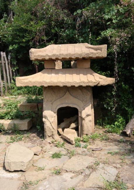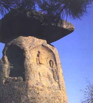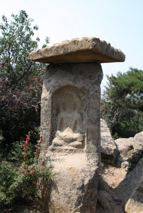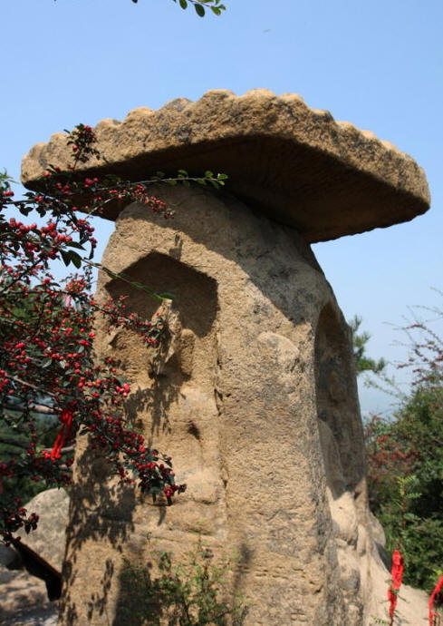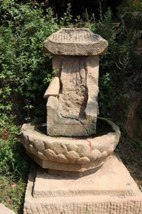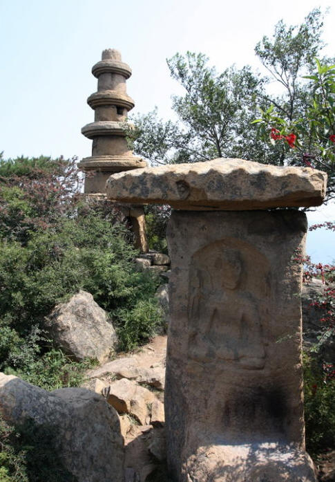 主峰极顶列为首区,有石塔两座,佛龛一区,龛为三块巨石叠成,下为卧羊,中为佛龛,上为瓦陇式屋顶,龛内内置一佛二菩萨,佛像结跏而坐,面型衣饰皆属北魏风格。