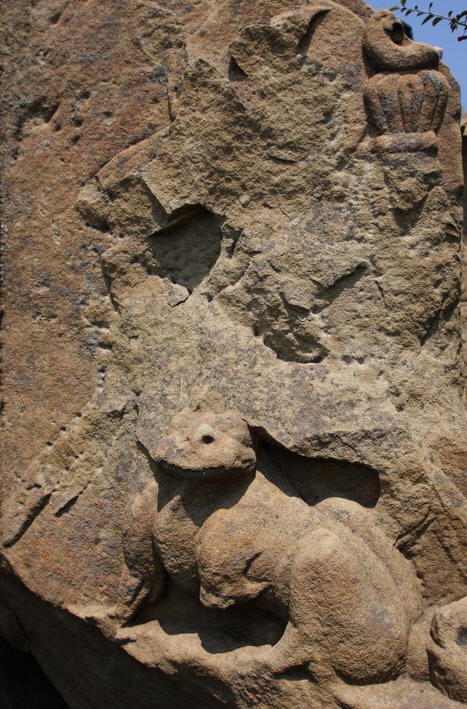 三号窟门外两侧雕的是菩萨造像,面部表情风化比较严重,但仍能看出菩萨的发型是高髻,衣饰飘带流畅自然。这个石窟是一石开两窟,两个窟门也有所不同。正 面的是风鸟门,是两只展翅的凤凰,周边雕有花草;窟石东侧的窟门是两条小龙。整个窟石表面共有大小龛30余处。从整体上看是北魏时期的。