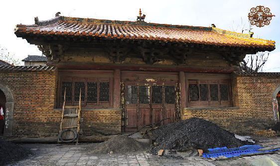 跨入山门,进入前院,映人眼帘的是高耸的过殿。过殿面阔三间,单檐硬山顶,琉璃瓦铺制,檐前由二根方形砖柱支撑过廊,廊前有十四阶石阶连接上下。过殿两 侧各有一座两层高楼,上层分别是钟鼓楼,下层是进入上院的通道。前院东西各有廊房三间,兰瓦铺顶,廊道各由两根木柱支撑,木柱下垫有石柱基,保存完好。