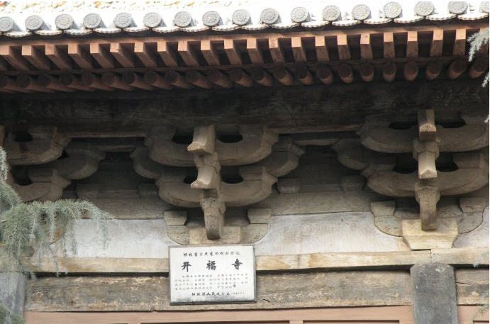 开福寺原为三进院,现存大雄宝殿、献殿、戏台,占地面积1095㎡,建筑面积500平方米。大雄宝殿为金代遗构,献殿为元代建筑,余皆明清所建。献殿面阔三间,进深六椽,单檐歇山顶。柱头斗栱五铺作单抄单下昂,梁架结构为四椽栿对后乳栿通檐用三柱。