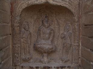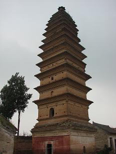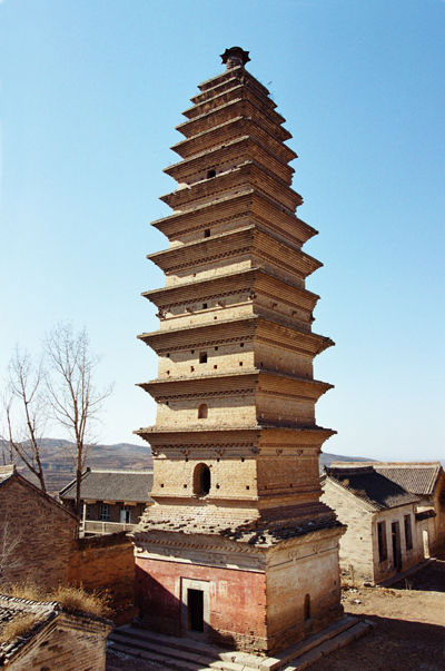 三圣瑞现塔位于陵川县城西南 32 公里西河底镇积善村西昭庆院内。昭庆院创建于隋,原名古禅寺。该塔第三层所嵌碑文记载:“大定六年(1166 年),舜都骼骸和尚行化至此,曾从昭庆院西掘出一只石龟,中藏肉髻珠一粒,背刊‘古禅寺三圣瑞现塔’;腹刊‘隋仁寿元年( 601 年)僧丰彦藏。’可知该塔是在隋代所建的古禅寺三圣瑞现塔旧基上重建起来。又从该碑文得知,该塔始建于金大定六年(1166年),至大定九年(l166 年)完工,历时三年”。现存三圣瑞现塔共高 14 层,檐作迭涩式,檐下加菱角牙子两重。一、二、三层檐下有四铺作斗棋,每面四垛,用砖砍削而成。塔平面方形,塔身外壁东面及内部正中、东侧各处共嵌有造像 碑 4 块。塔门南开,石质门框,框的东西内侧面有线刻龙牙花卉图案。塔室内有砖砌佛坛,其门框亦为石质,上有金大定五年(1166年)题记。坛上有佛龛,额书有 龙宫宝藏,坛中央有一小洞,传说为地宫之气孔。佛坛与塔身之间有甬道,顺甬道后转可达阶梯,由阶梯而上,可达各层。塔底层较高,塔门朝南,有石质门框,由 于此塔在隋代所造旧塔塔基上重建,所以虽为金代砖塔,仍存隋唐砖塔之风格。