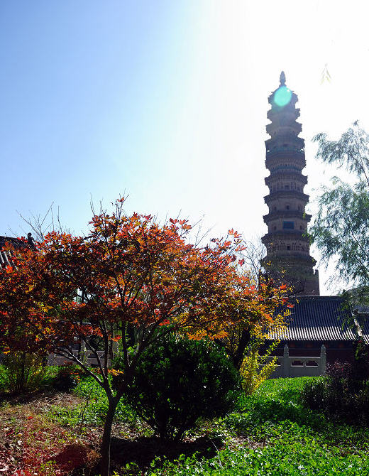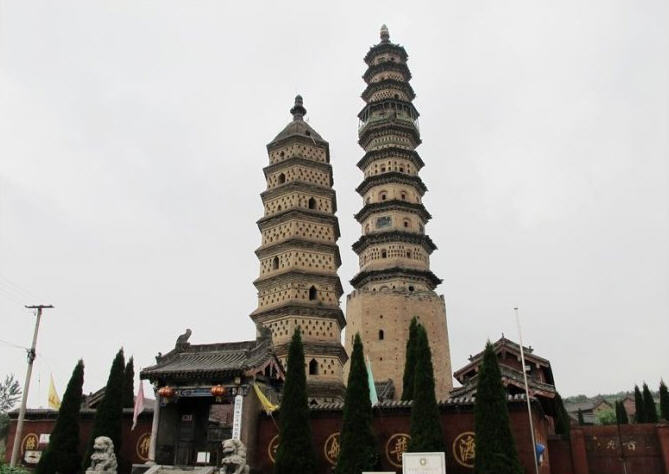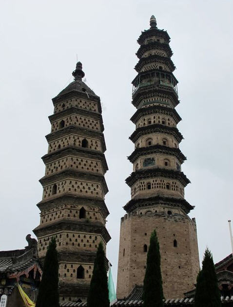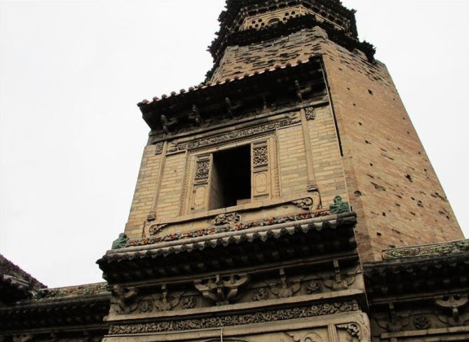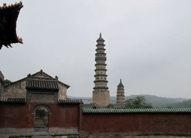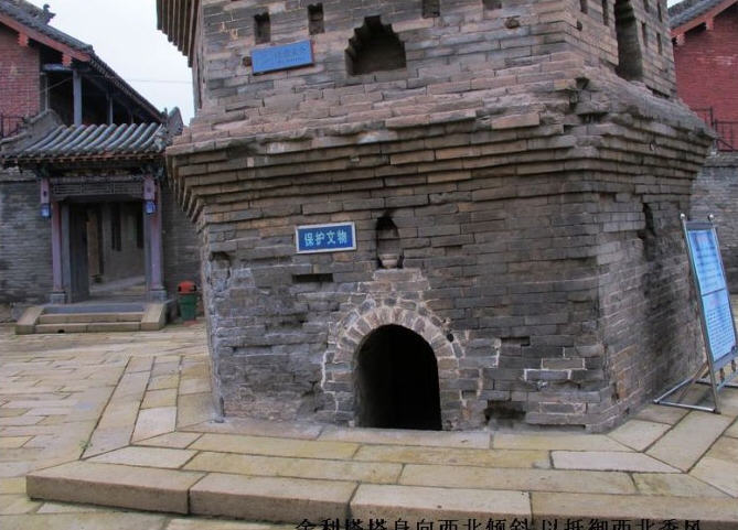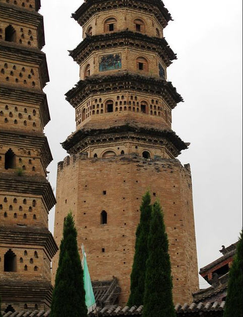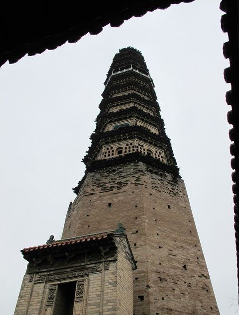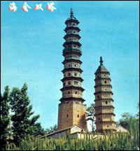其二为明代建舍利塔,八角十三级,高约五十米,功德主李思孝于明嘉靖四十年(1561年)建。第一层前端出单面抱厦,第十层支出平座,上置八根擎檐柱,成为高塔中的一层悬空楼阁。塔身各面仿宋塔设有佛龛。