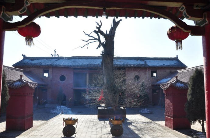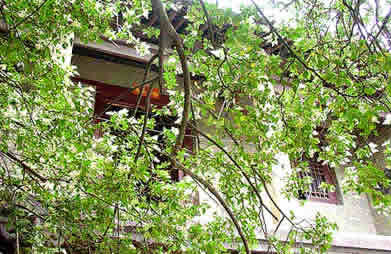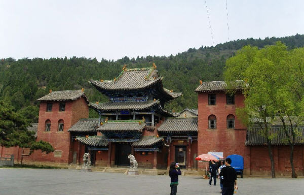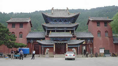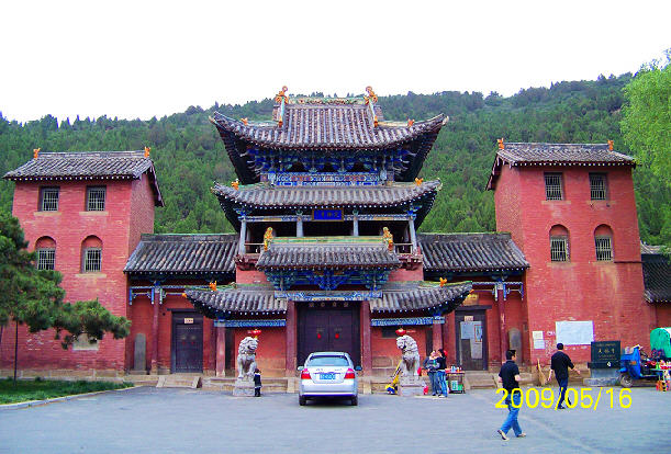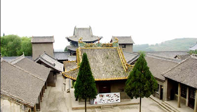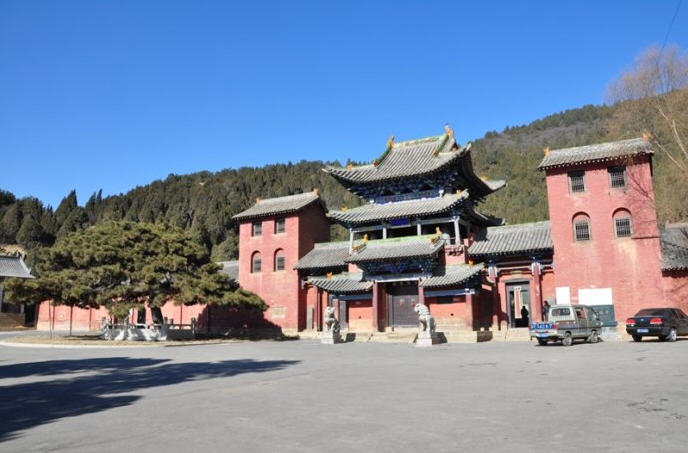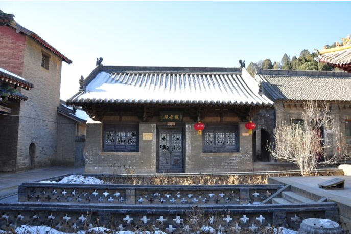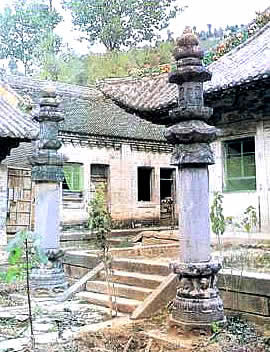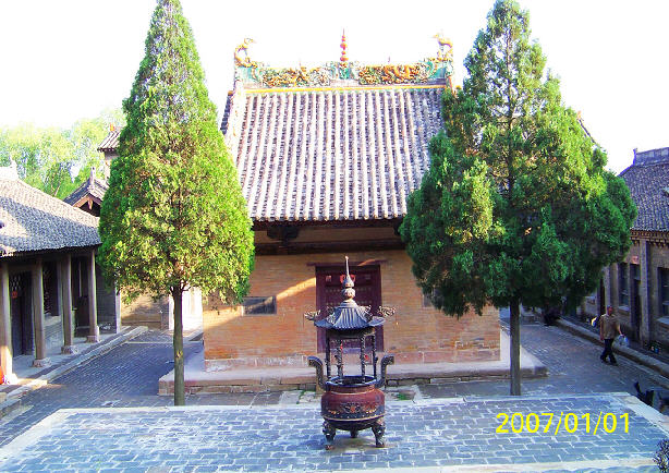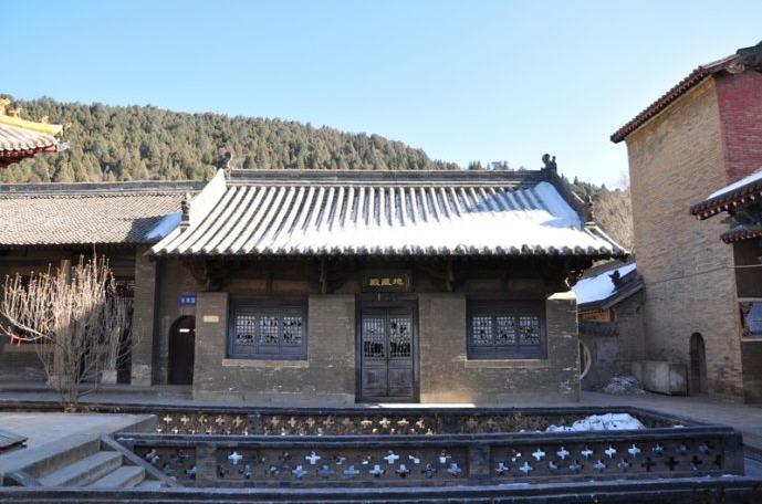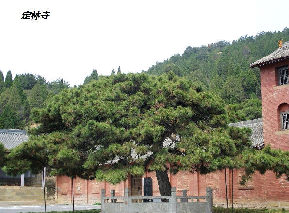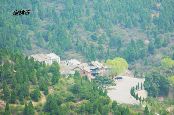 在后门枕石上刻有“元延佑四年四月二十日记”的字样。殿身面阔三间,进深六椽,单檐九脊 顶,斗拱精巧,前后明间开门,筒板布瓦盖顶,琉璃脊饰是金代琉璃制品的佳作,金碧辉煌。月台前竖有石雕八角形经幢两座,均高4.30米,一为弥勒出生宝 塔,北宋太平兴国二年(977)造,一为雍熙二年(985)造,经幢上刻有经文,仰莲、覆盆、宝珠顶。东配殿南北墙壁上绘有十殿阎君和有关地狱故事的壁 画,为明代所绘。三佛殿后左右有善法、罗汉二堂,内建“止涓”、“问津”二洞,定林泉水从此流出,涓涓有声,清澈甘美,终年不涸。从二堂间踏陡石阶而上, 是名为“最上乘”的一个别致小院,北为七佛殿,东西为楼阁,院内两侧耸峙二亭,登高远眺,山水楼阁之胜,尽收眼底。 寺院东侧有禅堂偏院,建筑精巧别致,院内有香瓜树两株,挺秀翠茂,瓜熟之时,芬香扑鼻。还有千年牡丹两株,华贵富丽。