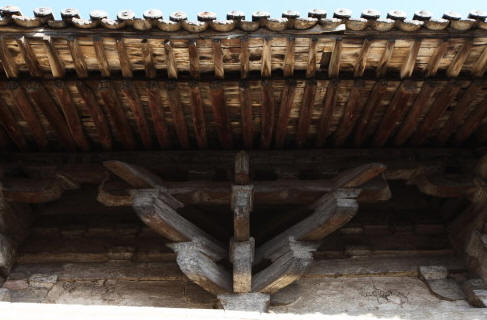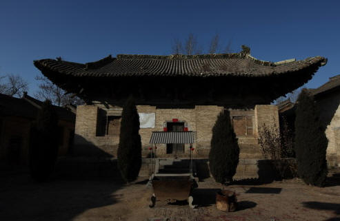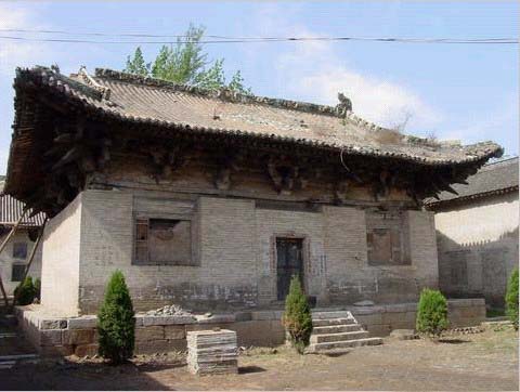 圆明殿创建于金代,重修于元代。现存主体结构为元代遗物。面宽五间,进深六椽,单檐悬山式屋顶,檐下柱头斗拱五铺作,单抄单下昂。