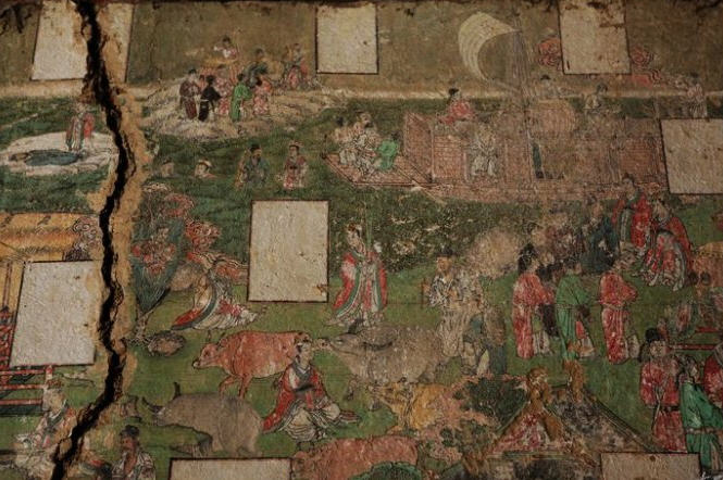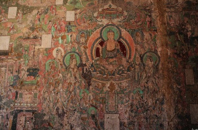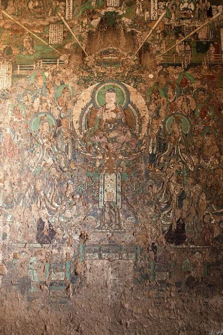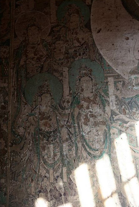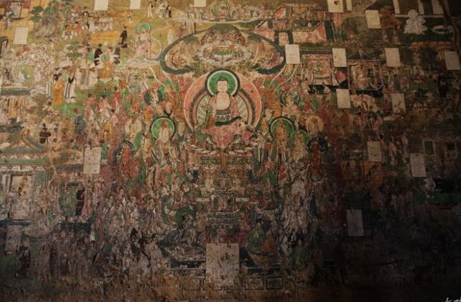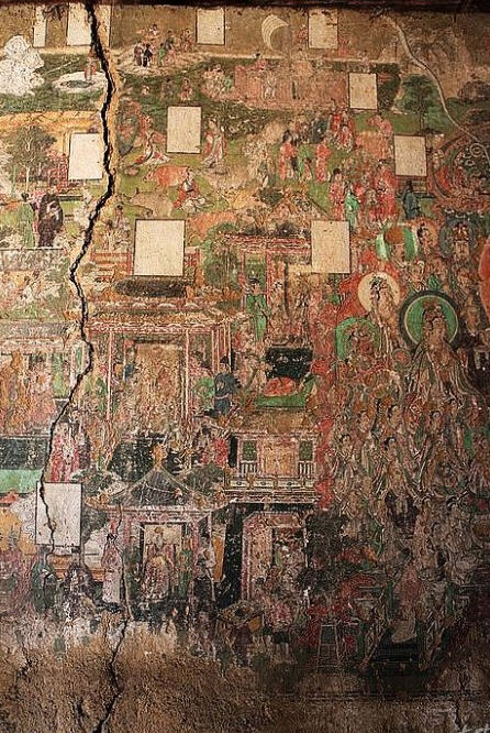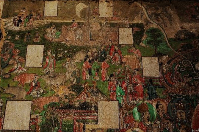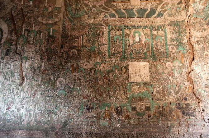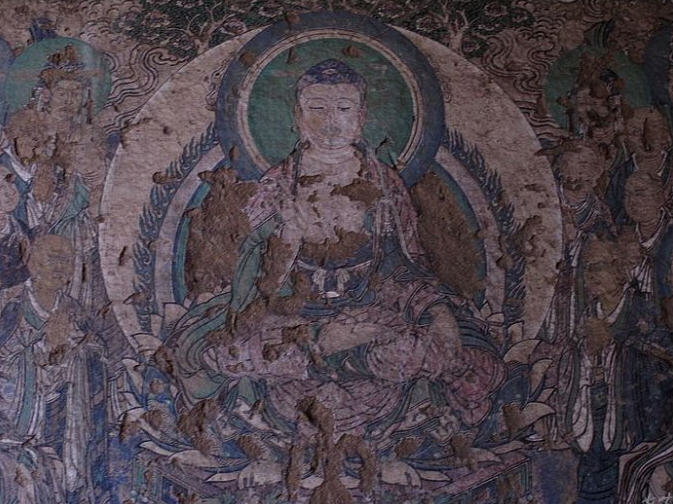 壁画的保存情况,各部分不同。东壁残损严重,部分画面已经漫漶不清,部分经过后人补绘过,是用连环画形式绘成的佛传故事。另外两壁的壁画保存较好。