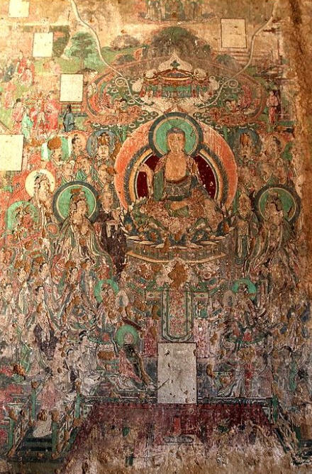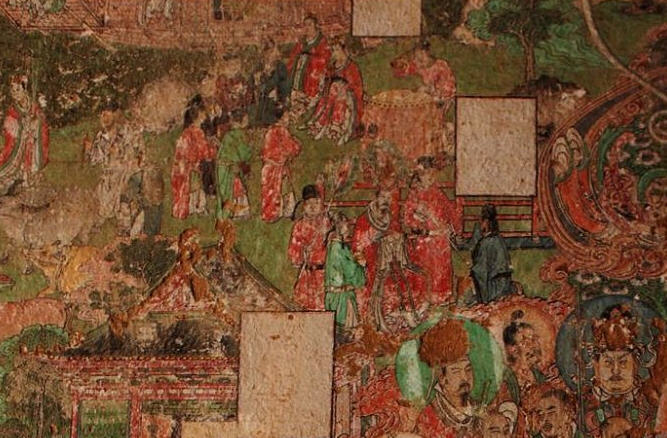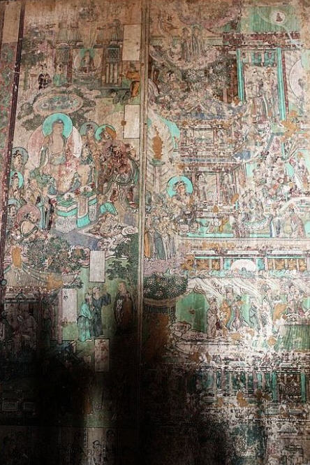 西壁大体分为三组,构图形式也采用连环画的形式。中间—-组是说法图,画的是西方净土世界日月灯光如来佛故事、华色比丘尼故事、忍辱太子故事和 转轮王舍身供佛故事等。华色比丘尼的故事画得最为精彩。佛经中讲述的故事是,华色比丘尼遭遇不幸,丈夫被毒蛇咬死,一个孩子被洪水淹死,另一个又被老虎吃 掉,她自己也被强盗掳去,霸占为妻。这个强盗很快就被官府捕获,处以极刑;她也被作为强盗的妻子一同活埋。但她幸而没有断气,后来得到释迦佛的点化,皈依 佛教,终于从苦难中解脱出来。壁画中《刑场》一段画面,表现的是华色比丘尼和她的强盗丈夫被处决时的情形,但赋予了中国的乡土风情和内容。画中一个骑白马 穿红袍和一个穿绿袍的官吏,由一群随从簇拥而来,华色比丘尼和她的强盗丈夫身带枷锁,被刽子手推到土坑边,坑旁还有两个手执铁锹的刽子手,正准备行刑。这 一段画面仅占二三十厘米见方的篇幅,图中众多人物却神情各异,复杂的情节内容刻画得鲜明生动,完全可以同当时精美的卷轴人物小品媲美。