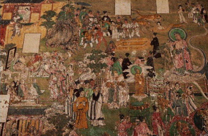 西壁的南面一组是佛经故事“须阁提太子本生”。北面一组也是佛经故事,画的是“善友太子本生”和“光明王舍头本生”故事。