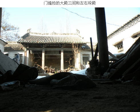 路过金村镇霍秀村,我们偶然发现一座庙宇,后来问了几个人,才知道这是一座牛王庙。山门为三间,不很高大,但两遍的偏房却比较高,形成一个插花式山 门。山门上的灰脊雕龙,为明带遗存。走近一看,哦,原来是一副青石门框,上方居然有皇庆元年的施柱题记。大门未开,我们只好从大门缝隙看看,里面有一个大 殿,门扇全无,成为一个棚状。也有左右垛殿,但看上去不算古老,大概为清代所建。院子里对方杂物很多,看不到碑记。