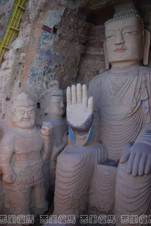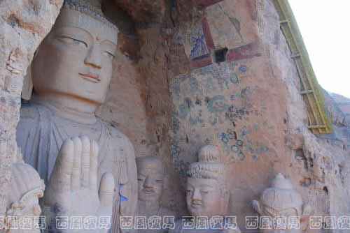 北魏、隋、唐、西夏期间均有扩建,至明、清时期已成为喇嘛教寺院。据明朝正统十三年(1448)《重修凉州广善寺铭》记载:明朝正统十年天梯山石窟尚存26处。由于天梯山石窟地质结构松软,在历次地震中有不同程度的损坏,仅1927年凉州大地震,就震毁洞窟10余处。1959年9月,因修建黄羊水库,窟址处水库淹没区,部分造像、壁画搬迁至甘肃省博物馆,北魏、隋唐时期的藏文经卷、绢画等由敦煌文物研究所保存。现在天梯山石窟仅存3层,大小洞窟17处。最大的洞窟残高30米,宽19米,深6米。窟内有释迦牟尼造像1尊,高15米,宽10米,大佛左右两旁有文殊、普贤菩萨,广目、多闻天王和迦叶、阿难等6尊造像,造形生动,神态威严,形象各异。窟内南北两壁上绘有大幅壁画。南壁为云纹青龙,中部为大象梅花鹿,大象背部驮有熠熠发光的经卷,下部是猛虎和树木花卉。北壁上部绘有青龙;中部绘有白马、墨虎、菩提树,马背上经卷闪闪发光;下部绘有牡丹花卉。整个壁画笔触清新,色泽艳丽,气势磅礴,形象逼真。大佛巍然端坐,左手平放在膝盖,略出膝部;右臂前伸,手掌外撑,向对面的山推去,所指之处叫磨脐山。对此,民间有“张义川,水湖滩,大佛爷手指磨脐山”的歌谣和许多美丽传说。 天梯山石窟是我国早期石窟的代表,不但为佛教的传播培养了人才,而且为石窟的开凿造就了力量,形成我国佛教艺术史上有名的“凉州模式”。石窟建成后,世人仿此陆续开凿了金塔寺、马蹄寺、文殊山、榆林窟等。后来,北魏在大同开凿云岗石窟时,主持人也是凉州僧人昙曜,所用能工巧匠大都是凉州人。因此著名考古学者宿白先生将新疆以东现存最早的佛教石窟在风格上称之为“凉州模式”。为了保护好这一珍贵的历史遗存,国家文物部门从1995年开始就立项修复天梯山石窟。目前,石窟第一期工程已顺利竣工,在淹没大佛的高峡平湖中已围筑出一道气势如虹的围堰,复原的大佛重现当年的风采。