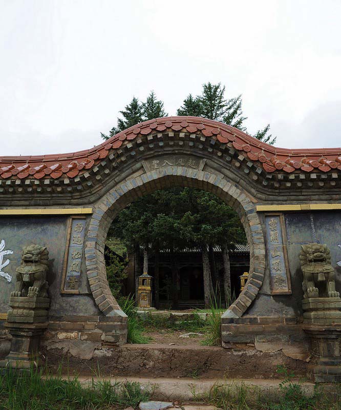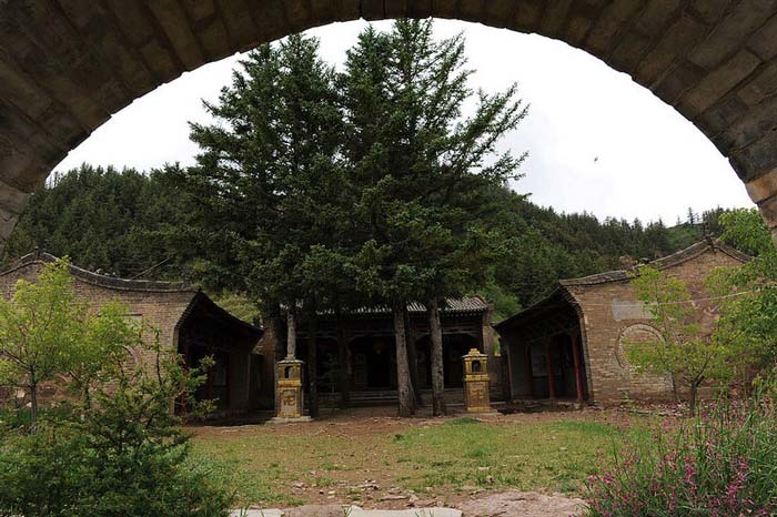 雪山寺依山而建,于外界通往寺院的曲径小道上,分设有两道山门,在一座拱形山门顶端,上书“堆银胜境”四个大字,赫然入目,两侧对联“有绿山色来古寺,无限风光入翠微”,引人注目。雪山寺四周松林环抱,北面山峰突兀,石崖嶙峋,松柏挺拔,苍翠如画。南面灌木丛生,北面乔木参天,判若鸿沟,迥然两样,置身其境,仿佛进入仙境一般。院内栽植有九大一小共十棵松树,主寺院占地面积不及十亩,整个寺院布局与山势走向巧妙结合,寺庙与山形地貌浑然一体。可谓深林藏寺,有曲径通幽之奇异景致。