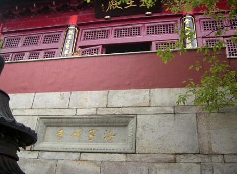 海宁禅寺座落于江苏省连云港市花果山南麓。花果山属云台山系,最高峰玉女峰海拔625.3米,号称江苏屋脊。花果山层峦叠嶂,山崖壁立,飞瀑直下,漱玉喷珠,古木参天,花草繁茂。据学者考证,吴承恩《西游记》中花果山胜境即取材于此。 海宁禅寺创建于唐,重修于宋,鼎盛于明、清,在历史上是一座富有浓郁地方色彩、佛道并奉的道场,但寺庙多由僧人住持。明神宗敕赐寺名“护国三元宫海宁禅寺”,并两次颁赐大藏经。1692年清康熙帝御笔书赐“遥镇洪流”匾额,寺院香火益盛,遂成为苏北、鲁南佛教重镇,有淮海第一丛林之称。乾隆、嘉庆、道光年间俱有修葺,民国初年雄姿依旧,惜抗战中毁于日军炮火,建筑及珍贵文物几近荡然。 1979年,江苏省、连云港市人民政府拨款按明代布局重兴寺宇。1993年,海宁禅寺作为佛教活动场所开放,昌鉴法师率领四众弟子募缘增饰殿宇佛像,并凿池建亭,广植花木,使千年古刹焕然一新。已故中国佛教协会赵朴初会长为该寺题写了“海宁禅寺”、“大雄宝殿”及“云台山僧众抗日纪念碑记”,当代高僧茗山法师为大雄宝殿题写联语:“殿前银杏供花,祖师曾拈花悟旨;山上猿猴献果,行者当识果知因。” 1998年11月28日,海宁禅寺举行佛像开光暨钟鼓楼奠基庆典,一时海内外嘉宾云集,蔚为盛事。2001年9月26日至10月11日,连云港市政府举办首届中国《西游记》文化节,海宁禅寺为此举行了盛大的“迎请唐玄奘法师顶骨舍利供奉仪式”,半月内,海内外嘉宾和四众弟子万余人前来瞻礼。 海宁禅寺倡导学修并重、以学导修、以修正学的道风,不断健全丛林规制;重视佛教文化事业,建立有佛教图书馆,经常开展笔会、书画展;本着“庄严国土,利乐有情”的精神,九年来为赈灾、办学、社会福利事业捐资数十万元。