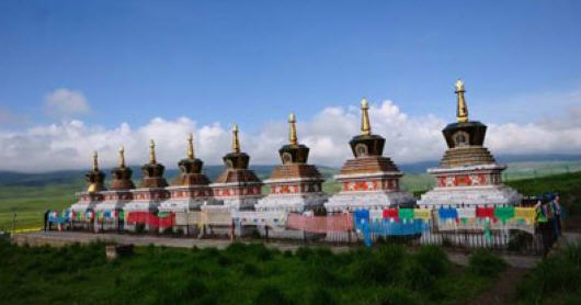 八宝如意塔:也叫善逝如来八塔,从东到西依次是善逝塔、菩提塔、转法轮塔、神变塔、天降塔、和平塔、尊胜塔、涅槃塔。