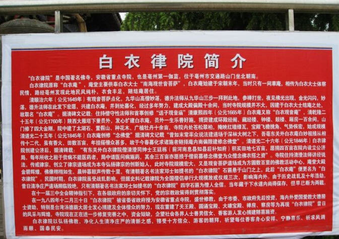 “白衣律院”是安徽亳州第一伽蓝,也是中国的著名佛寺之一。白衣律院位于毫州市内谯陵路东,山门坐北朝南,寺院讲经说法传律,十方信众、游客观光朝拜,四方僧侣游方挂单,是全国四大律宗寺院之一。