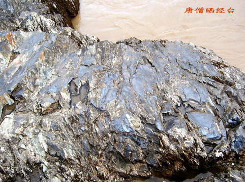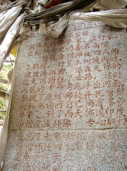 相传,当年唐僧师徒四人去西天取经,有一日来到通天河口。这时,天近傍晚,夜幕降临,忽听得前面滔滔作响,声震四方。上前仔细一看,发现是条大河。但见那河水在夜幕下浩浩荡荡,缥缈迷离,不知河有多宽,水有多深。猪八戒顺手拣起一块鹅卵石抛入河中,想探探河水深浅,只听得咕嘟嘟一声,只泛起几丝鱼津,就沉下了水底,原来河水很深。孙悟空跳上半空引颈四望,可是,岸上不见一个人,河上没有一条船,却见不远处立有一块石碑,碑上刻有“通天河”三个篆文大字,下面还有十个小字:“径通八百里,亘古少行人”。唐僧见此情景,只得暗暗叫苦落泪。 再说,当时通天河有一千年老龟,得知唐僧一行要去西天取经,它想托唐僧到西天佛祖那里帮它打听一下自己的寿命还有多长,便主动游过来,驮唐僧师徒过河。过河时,唐僧满口答应,可是到了西天后,却把此事忘得一干二净。等他取经回来路过通天河时,方才想起老龟托他打听“归着”之事。那老龟自唐僧走后,朝等暮盼,一等就是十多年。如今见唐僧师徒取经回来不胜喜欢,便高高兴兴迎上来驮唐僧过河。老龟驮着唐僧一行走出不远,便问唐僧,托他打听“归着”之事可曾打听。唐僧只好搪塞一番。老龟知道唐僧不曾打听,一气之下,摇身一晃,将他师徒几个连人带马统统掀下河去。悟空、八戒、沙僧赶忙一边救唐僧,一边捞经卷,可惜那经卷有些早被水冲走,有些被水淋湿。唐僧只得将淋湿的经卷放在岸边的一块大石头上面,一一晾晒。谁知那经卷上的字却印在了石头上。至今字迹犹存,清晰可辨。后来,人们把这块石头称为“晒经台”。