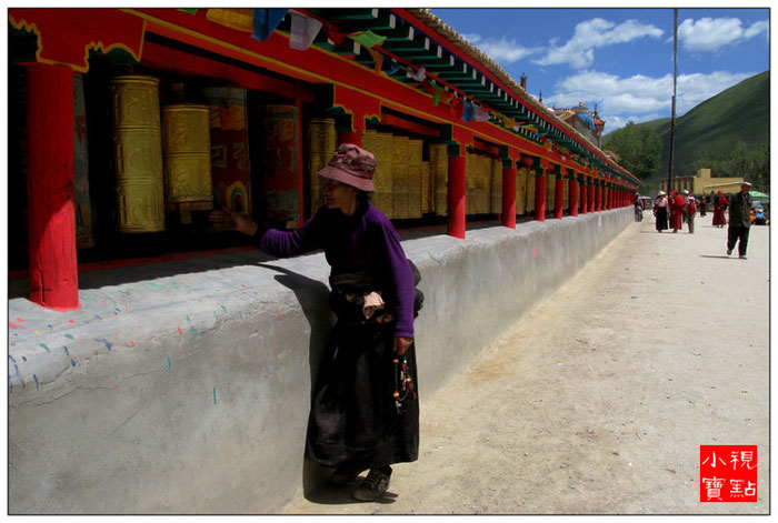新寨嘛呢石堆城前转经的信徒。藏族人普遍信仰藏传佛教,信教必须经常念经,但很多人不识字,于是便转经轮。