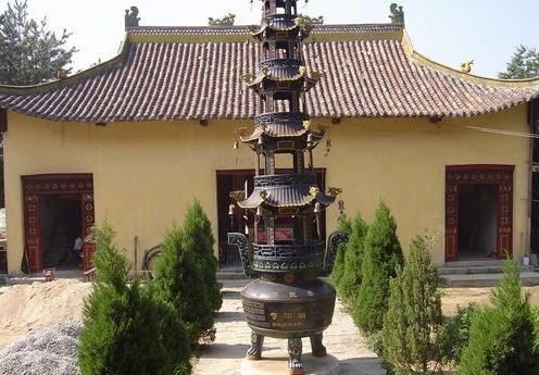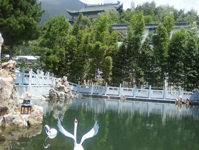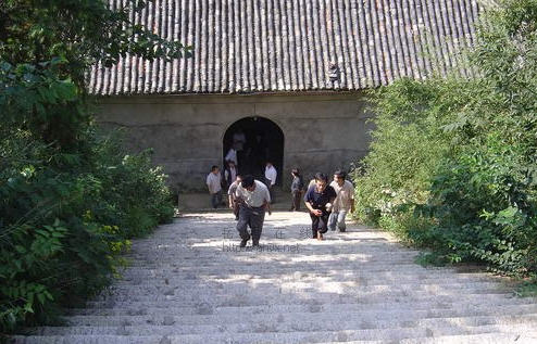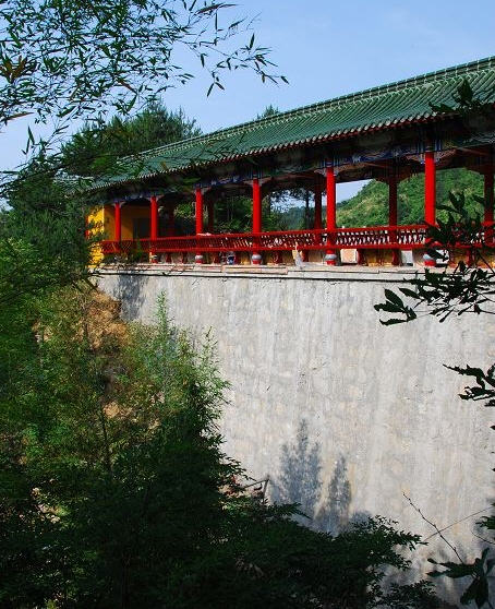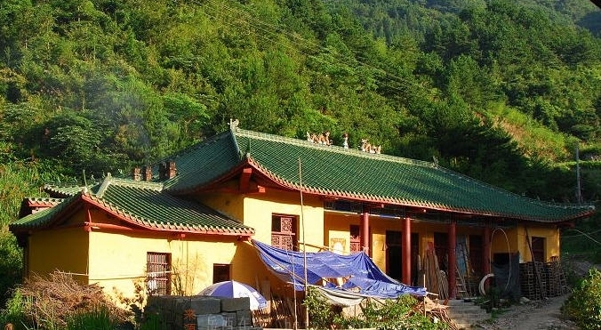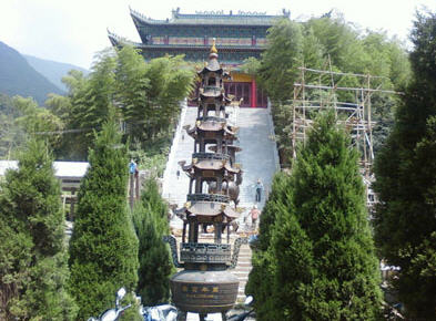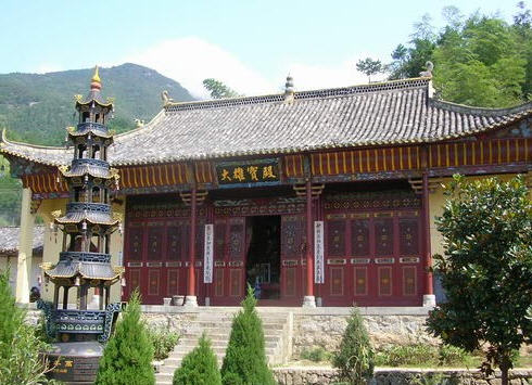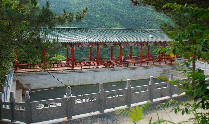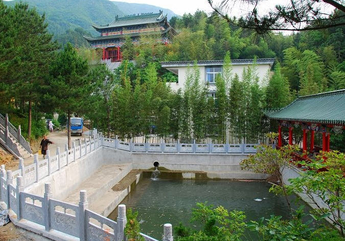 朝阳净寺位于县城以北30华里的温泉镇境内,途经龙井水库,我们乘座的小车经过近四十分钟的艰难上坡山路终于到达目的地。这是一块海拔八百多米,四周环山形似莲花的风水宝地,尽管今天出发时县城气温很热,这里却是另一番天地,气候凉爽,空气清新宜人,一条小溪环寺院而流,寺院周围郁郁葱葱,环境极其幽静,景色十分宜人。