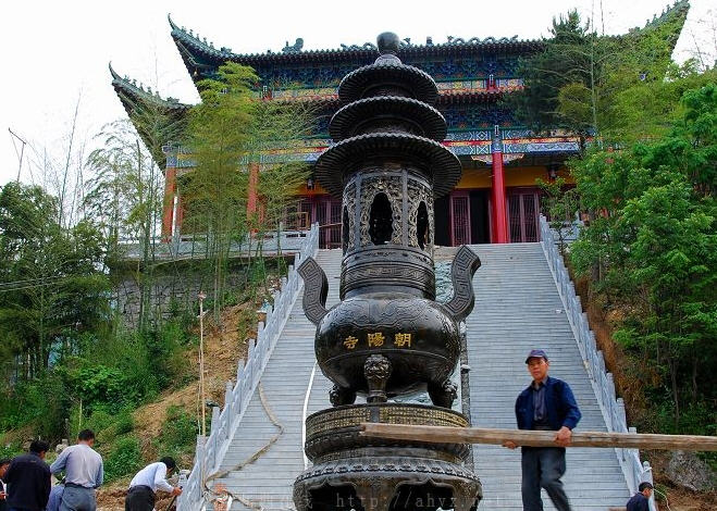 上文下诚法师,于二十世纪末,远来岳西,驻锡朝阳,慈行广度,影响日增。为酬众所请,允弃茅蓬,于旧地址处依山就壑,整谷为地,凿石为基,筑坝为池,历经数载,建成大雄宝殿、天王殿、观音殿、地藏殿、九龙丹墀、百步阶、钟鼓楼、下客堂、斋堂、放生池、滴水观音、亭榭、长廊等主体及功能建筑,一座庄严的现代化佛寺已初具规模。规划后续建筑之藏经楼、念佛堂、上客堂、七宝塔、佛学院、老年中心、观音菩萨露天铜像等,亦将择机启建。嗣后,还将有一湖、一谷总体开发计划可供实施。可以预期,一个普被三根、广利有情、功能齐备、具有相当规模的佛教正法道场,必将呈现于世人面前。届时朝阳寺将一如既往,坚持道风建设与道场建设并重的建寺方针,大力传承并光大佛陀教育事业;同时,愿与教内仁人志士一起,为岳西发展、社会进步、国家富强、世界大同做出应有的贡献。
