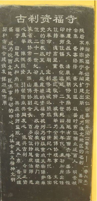 在阜阳市区大寺街。始建于北宋嘉祐年间(1056—1063),扩建于熙宁年间(1068—1077)。明万历,清康熙、乾隆、道光等均进行过重修。因规模宏大,民间俗称之“大寺”。现存前、中、后三进院落,南北长117米,东西宽51米,面积5967平方米。有房屋70间,其中有大殿、藏经楼、山门等。大殿面阔5间,通长20.7米,进深3间,跨度10.9米整个建筑具有宋代风格。是安徽淮北地区保存比较完整、时代较早的寺庙建筑。1992年起进行全面修葺。